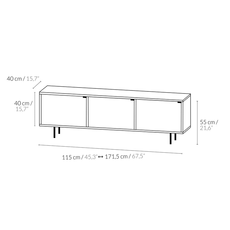 Sideboard 2 doors: width 60–115 cm, height 80 cm and depth 40 cm. Sideboard 3 doors: width 115–171,5 cm, height 80 cm and depth 40 cm. Sideboard 4 doors: width 171,5–228 cm, height 80 cm and depth 40 cm. Sideboard 5 doors: width 228–280 cm, height 80 cm and depth 40 cm. TV Stand 2 doors: width 60–115 cm, height 55 cm and depth 40 cm. TV Stand 3 doors: width 115–171,5 cm, height 55 cm and depth 40 cm. TV Stand 4 doors: width 171,5 –228 cm, height 55 cm and depth 40 cm. TV Stand 5 doors: width 228 –280 cm, height 55 cm and depth 40 cm.The price is the same across the full width range within each door count — you pay based on the number of doors, not the exact centimetre.