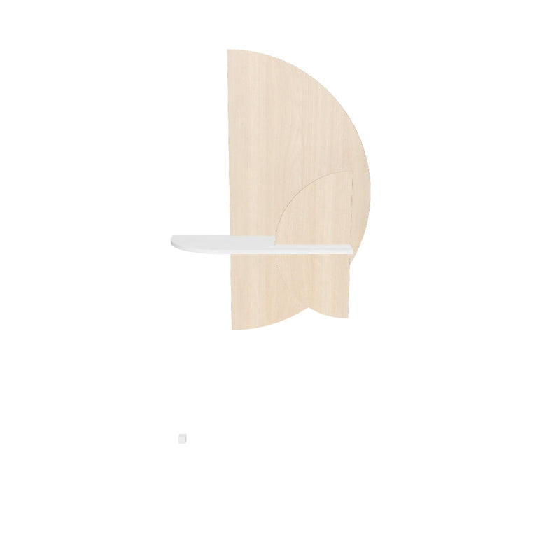 Composed of 3 flat pieces of Plywood and a metal bracket that is fixed on the wall. The arrangement of these pieces gives the product the ability to hide objects behind the vertical pieces, since there is a separation between them. In the shelf version (M), we have a small space behind the front piece (sun or moon) to hide small objects such as keys, a wallet, a smartphone, etc. Also, there is a hidden hole in the base that allows us to feed the cable to charge our devices.