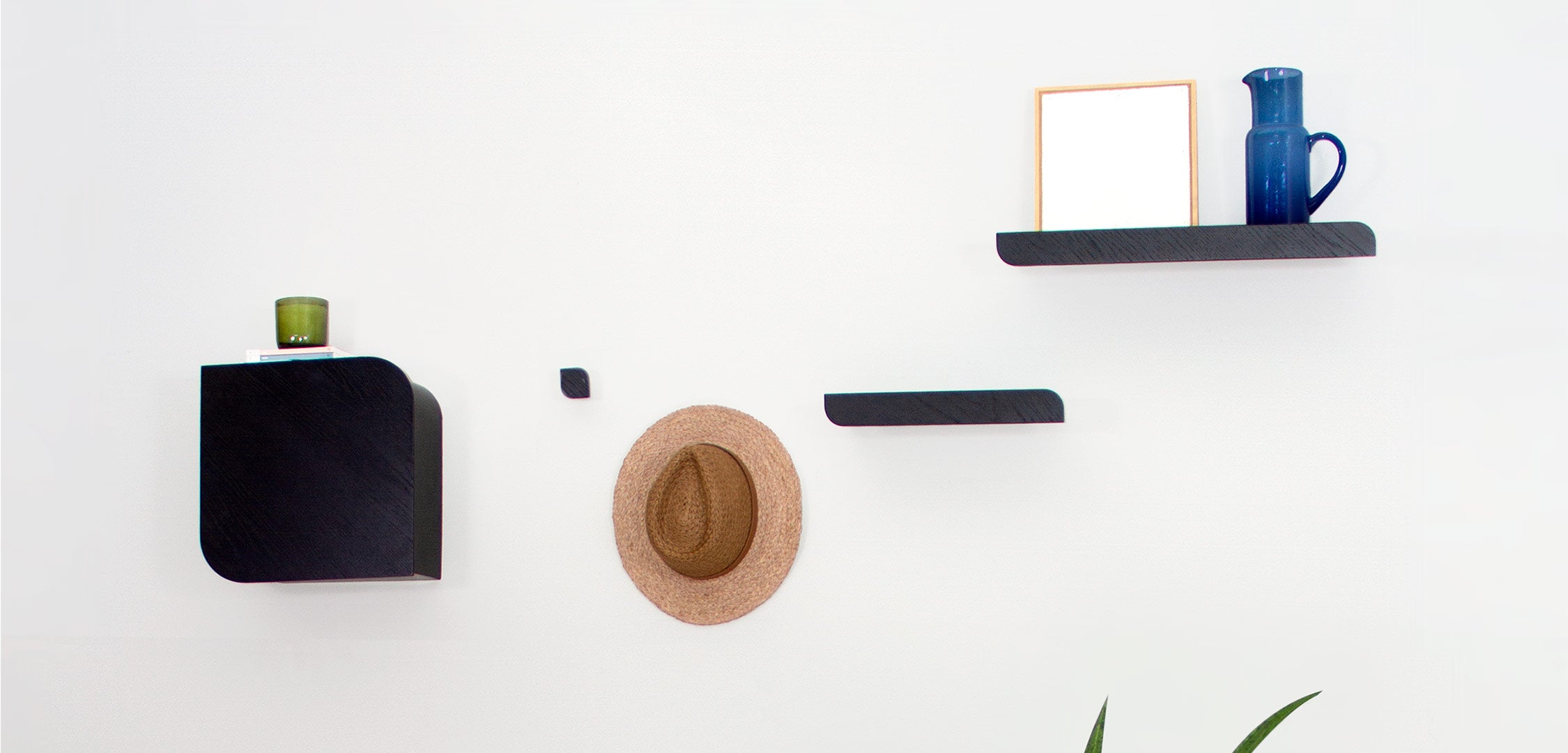 The design of all pieces consists of a front piece made from Oak, Walnut, or Ash plywood veneer that is larger than its narrower back part. This front part hides its back horizontal metal shelf, creating a shelf in which the front piece works as a topper, perfect to place decoration objects or hide small ones.