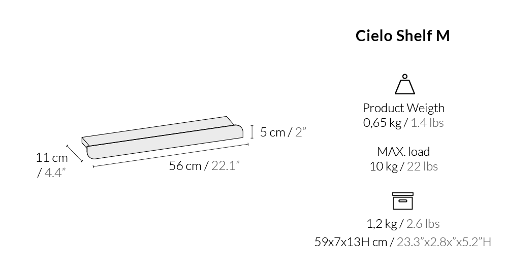In the Cielo Shelf, this space is 10cm wide (4 in), meaning that all objects under this size will fit perfectly on top of it.