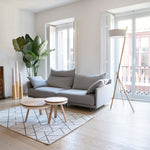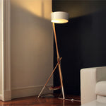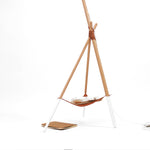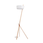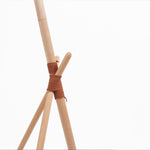 This piece its characterized by its simple and elegant lines that are drawn from an elegant structure of cylindrical beech wood slats, in the shape of a tripod, and are joined together by a leather cord. Additionally, at the top of the pole there is a large metal screen that filters light through a natural cotton diffuser that creates warm and welcoming spaces.