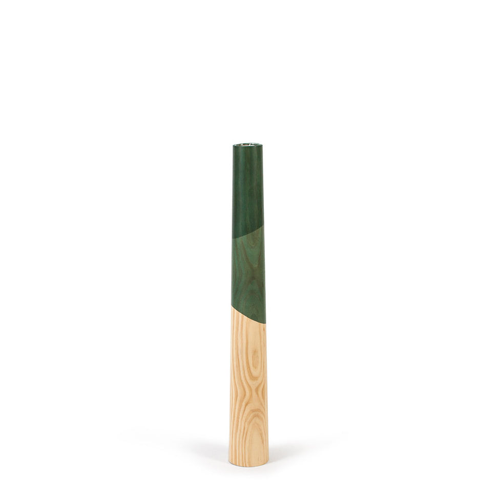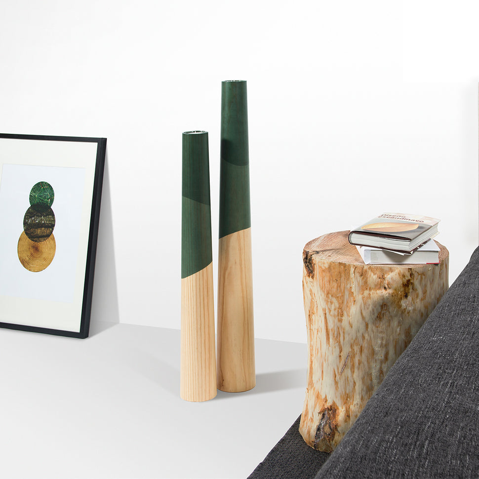 A collection of large standing wooden candle holders, ideal to give a touch of light and color to any environment. Simple and clean lines with a conical shape made of solid wood, and a design inspired by nature.