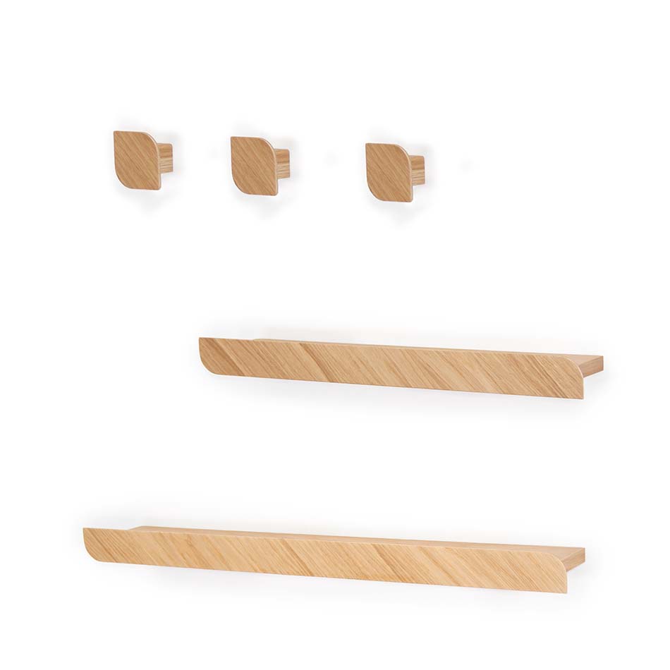 Carefully designed to work as a composition, Cielo consists of three types of pieces: a shelf (available in three different sizes), a set of hooks, and a wall cabinet. These pieces come together to create a balanced and harmonious combination that quickly enhances any space and brings nature inside.
