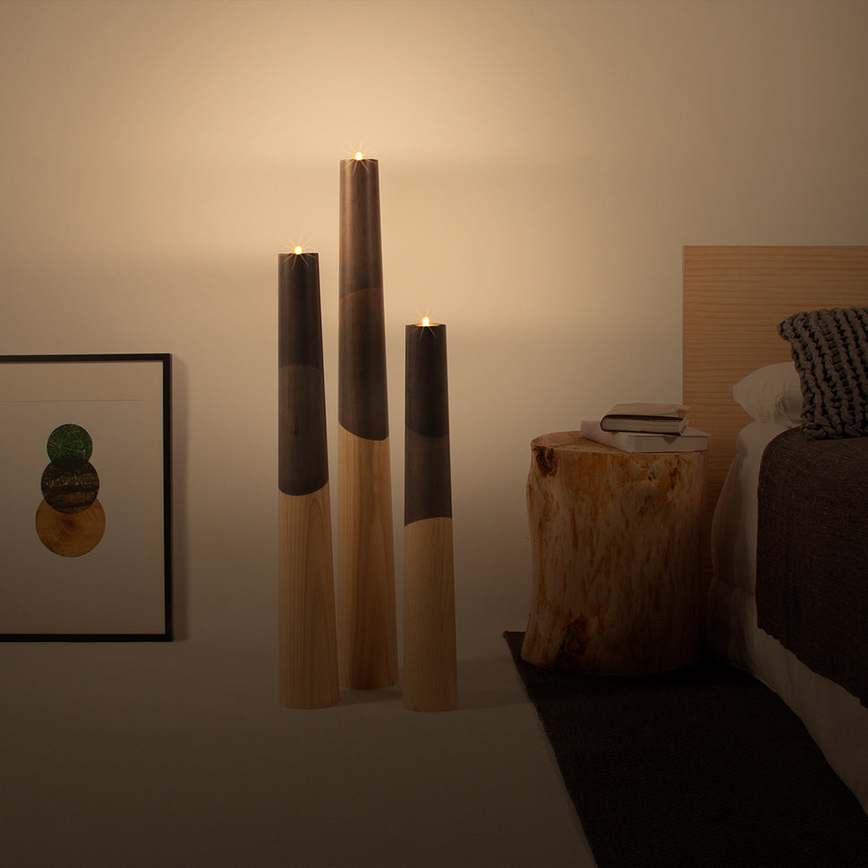 A collection of large standing wooden candle holders, ideal to give a touch of light and color to any environment. Simple and clean lines with a conical shape made of solid wood, and a design inspired by nature.