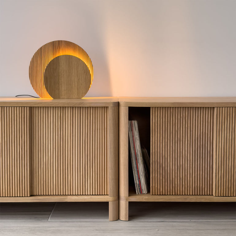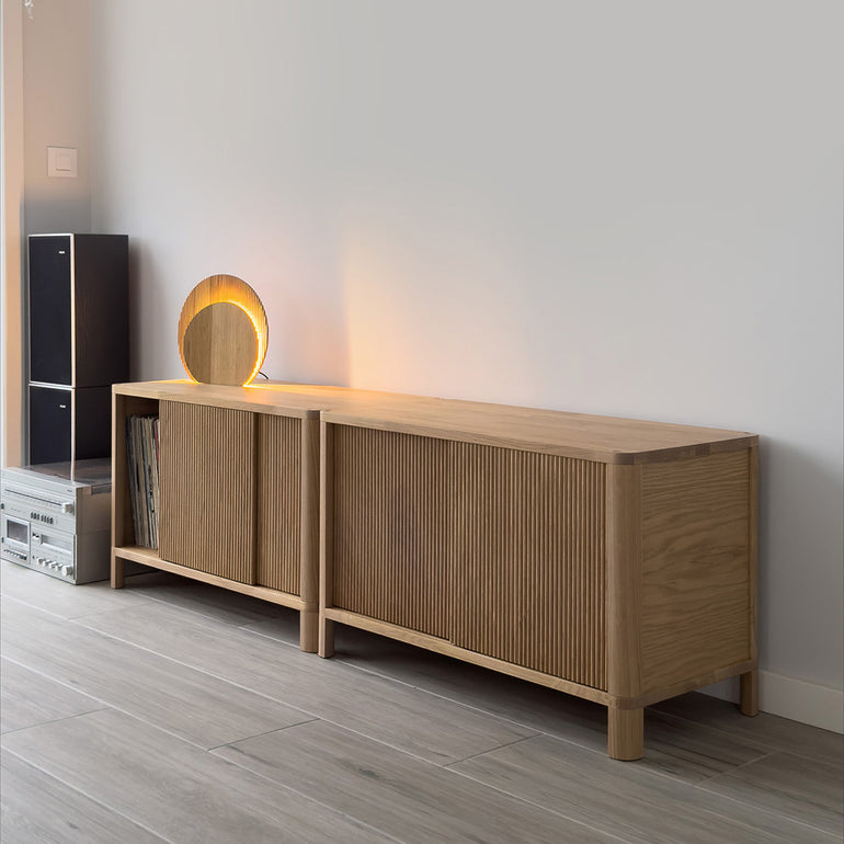 Side and back panels of the closed modules: MDF fiber with natural Oak wood veneer.