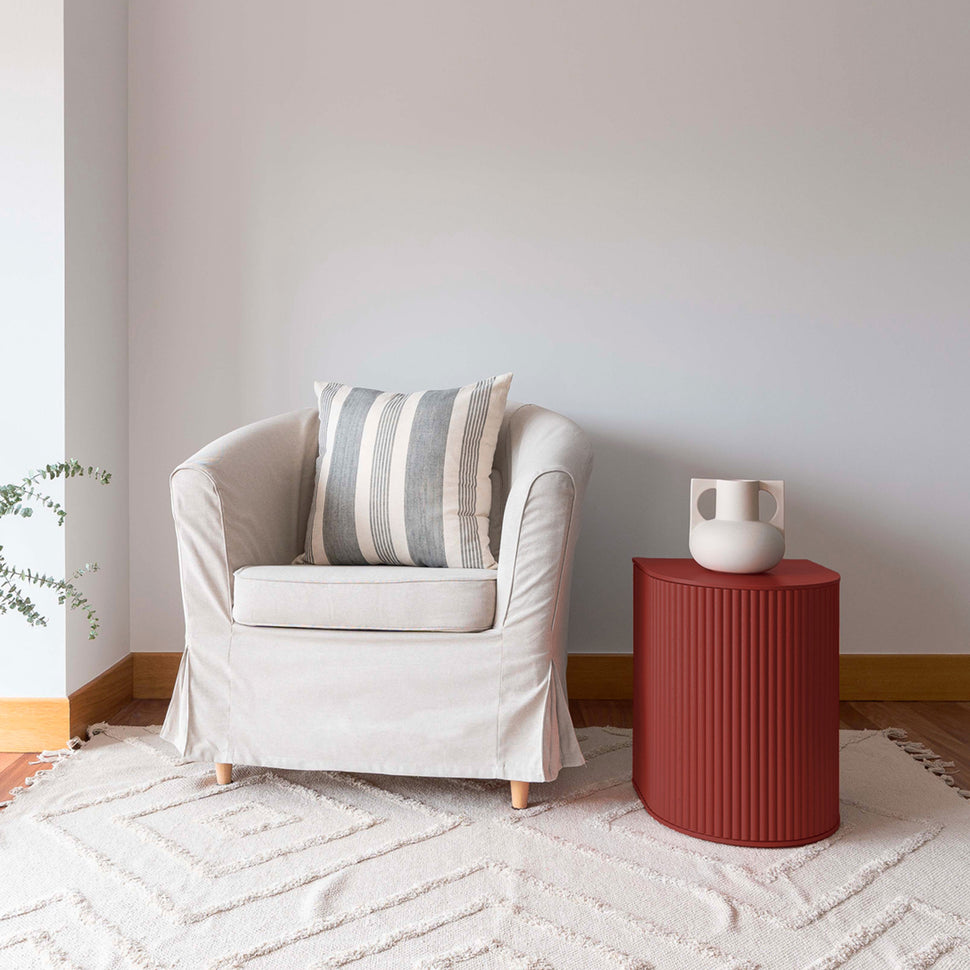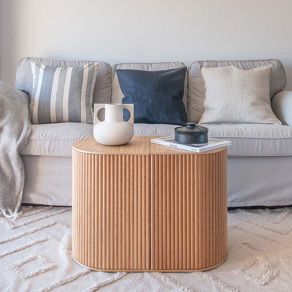 A shifting stool with the possibility of being used as a seat, including a storage space perfect for blankets or books. With an iconic texture that makes an automatic statement piece that completes a room with a memorable look. And even more functional, with its design perfectly connecting giving the possibility of connecting two stools in the center and creating a side or center table.