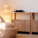 Side and back panels of the closed modules: MDF fiber with natural Oak wood veneer.