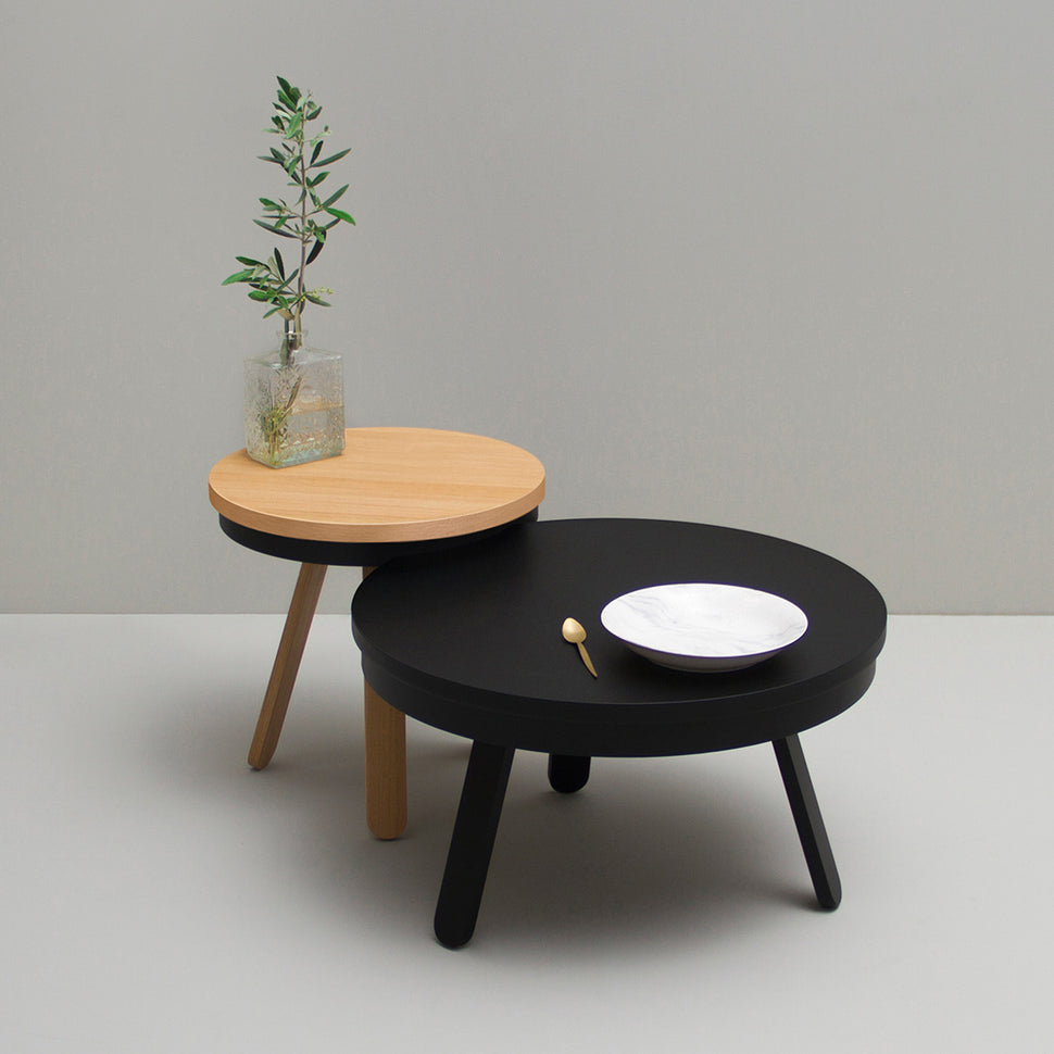 The medium-sized member of the Batea family is not just a wood side table, it has extra functionality, a small storage space where you can keep those small everyday objects out of sight and organized.