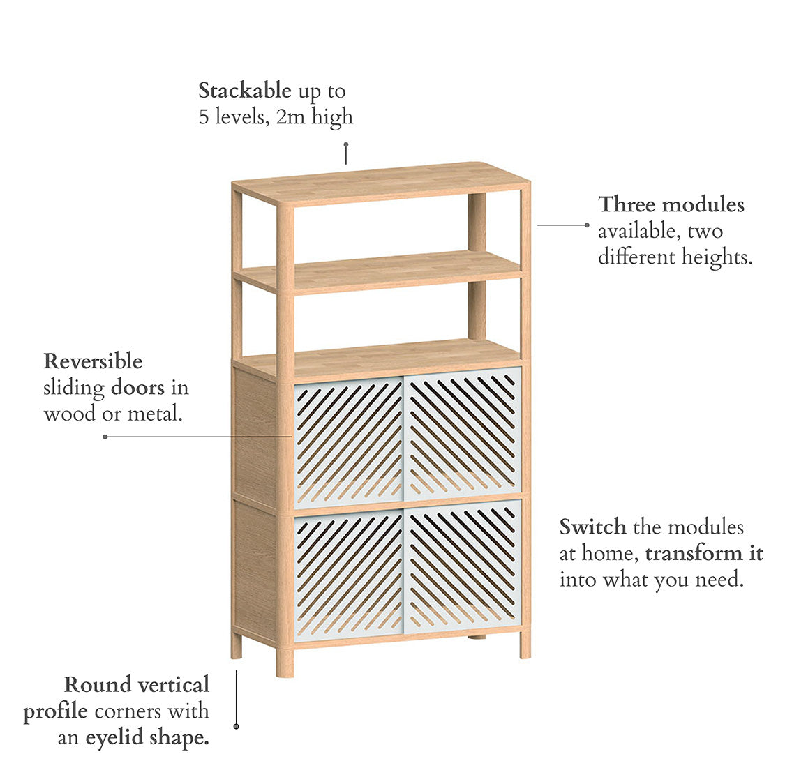 Three horizontal modules available in two different heights. A closed high module that allows to add doors, an open high module without doors, and an open short module.