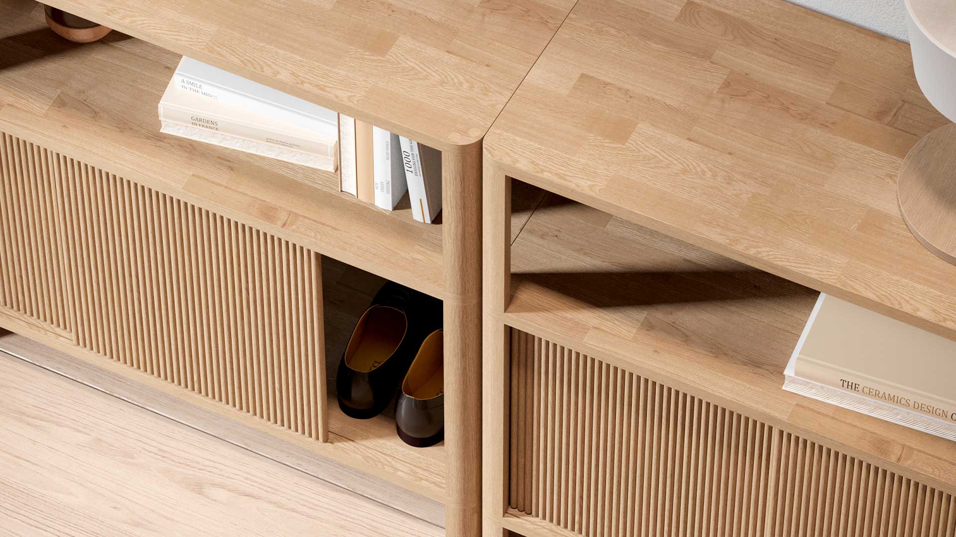 A new fusion of decoration and functionality, characterized by bold, graceful lines. Designed with semi-hidden compartments and a double-height design to keep your space organized without compromising style.