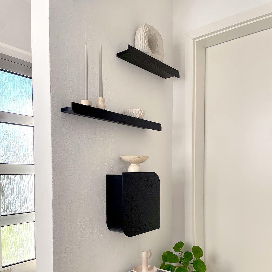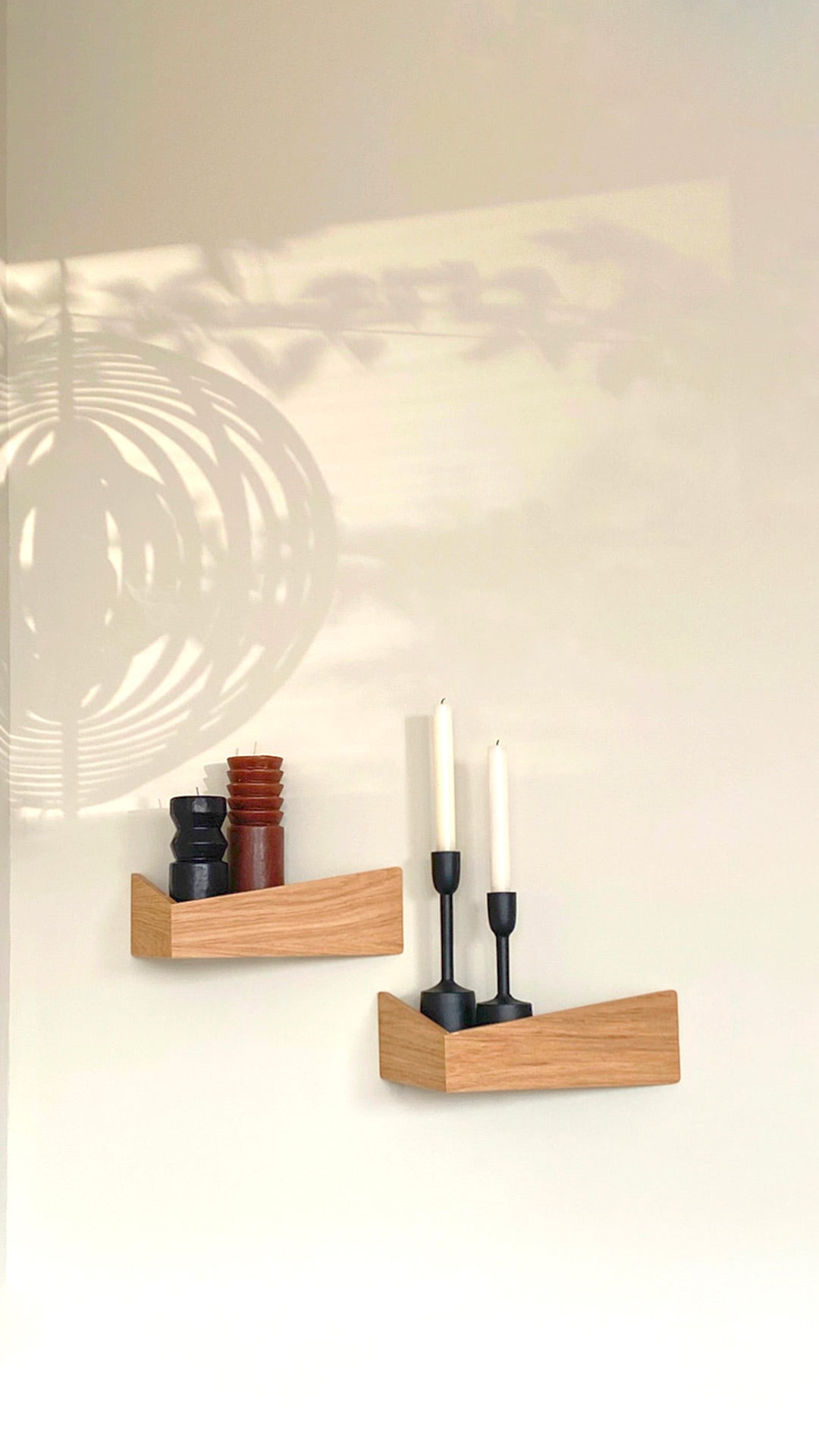 Minimal wall shelfs with hidden hooks to bring decoration and functionality together, storing or exhibiting your favorite objects.