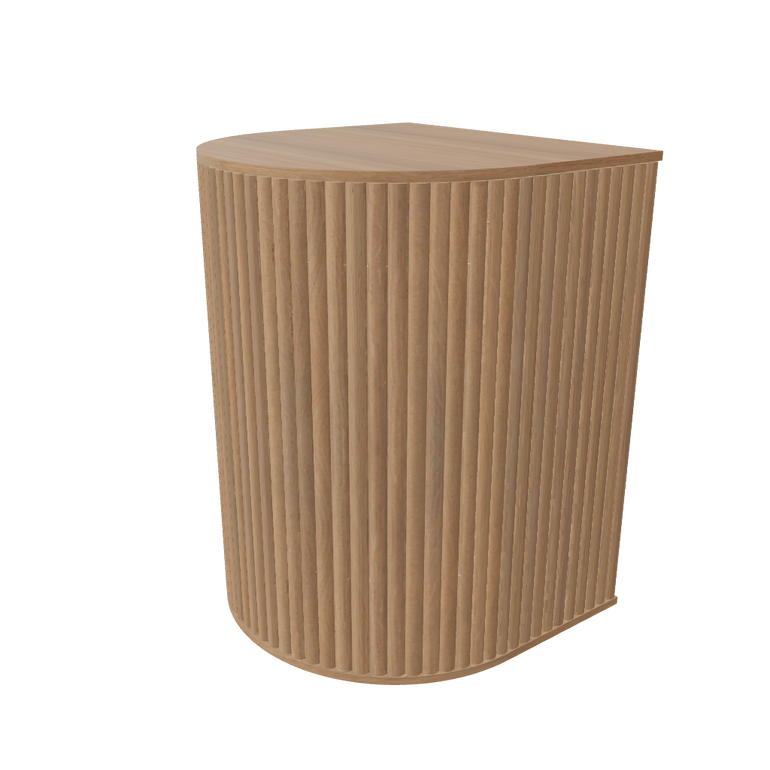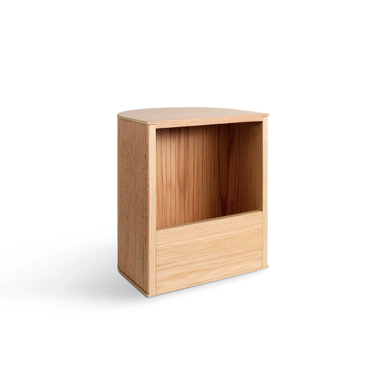 Duna is a sculptural side table crafted to sit beside a sofa, armchair or bed. Its compact silhouette and semi-open storage create a tidy surface for a lamp, a drink or a book, plus a handy niche for everyday objects like magazines or throws. The piece is designed to bring tactile warmth and visual balance without taking up visual weight in the room.