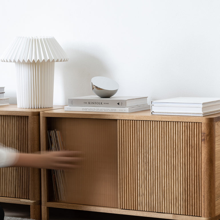 Side and back panels of the closed modules: MDF fiber with natural Oak wood veneer.