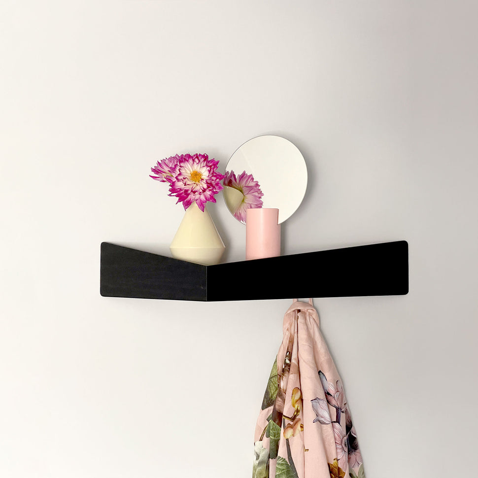 Our unique wall shelf and hooks combination gives you a great organization opportunity for your space.