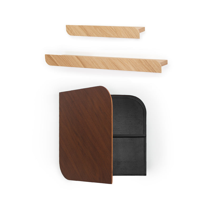 The design of all pieces consists of a front piece made from Oak, Walnut, or Ash plywood veneer that is larger than its narrower back part. This front part hides its back horizontal metal shelf, creating a shelf in which the front piece works as a topper, perfect to place decoration objects or hide small ones.