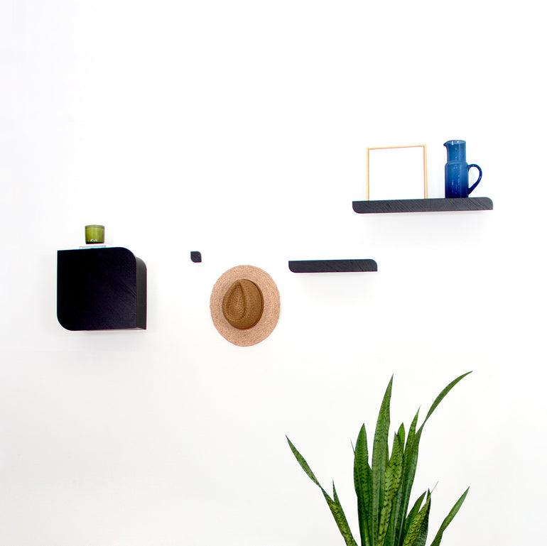 Carefully designed to work as a composition, Cielo consists of three types of pieces: a shelf (available in three different sizes), a set of hooks, and a wall cabinet. These pieces come together to create a balanced and harmonious combination that quickly enhances any space and brings nature inside.