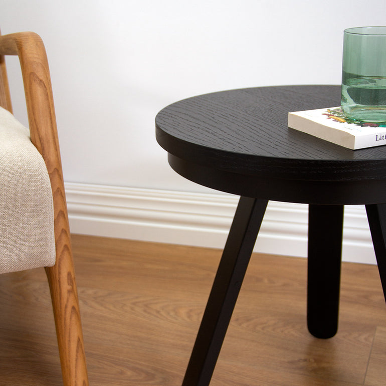 Designed with clean and rounded lines, this side wood coffee table consists of a tray made out of wood veneer and three legs of solid wood that can be easily fixed to its lacquered metal structure.