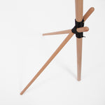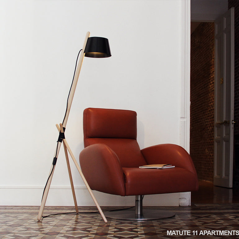 Its elegant and simple lines are drawn from a sophisticated structure of cylindrical slats of beech wood in the shape of a tripod. Finally, these pieces are joined together by an elegant leather cord. Also, at the top of the mast there is a small metal screen that radiates a direct light ideal for reading your favorite book or magazine.