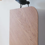 The design of all pieces consists of a front piece made from Oak, Walnut, or Ash plywood veneer that is larger than its narrower back part. This front part hides its back horizontal metal shelf, creating a shelf in which the front piece works as a topper, perfect to place decoration objects or hide small ones.