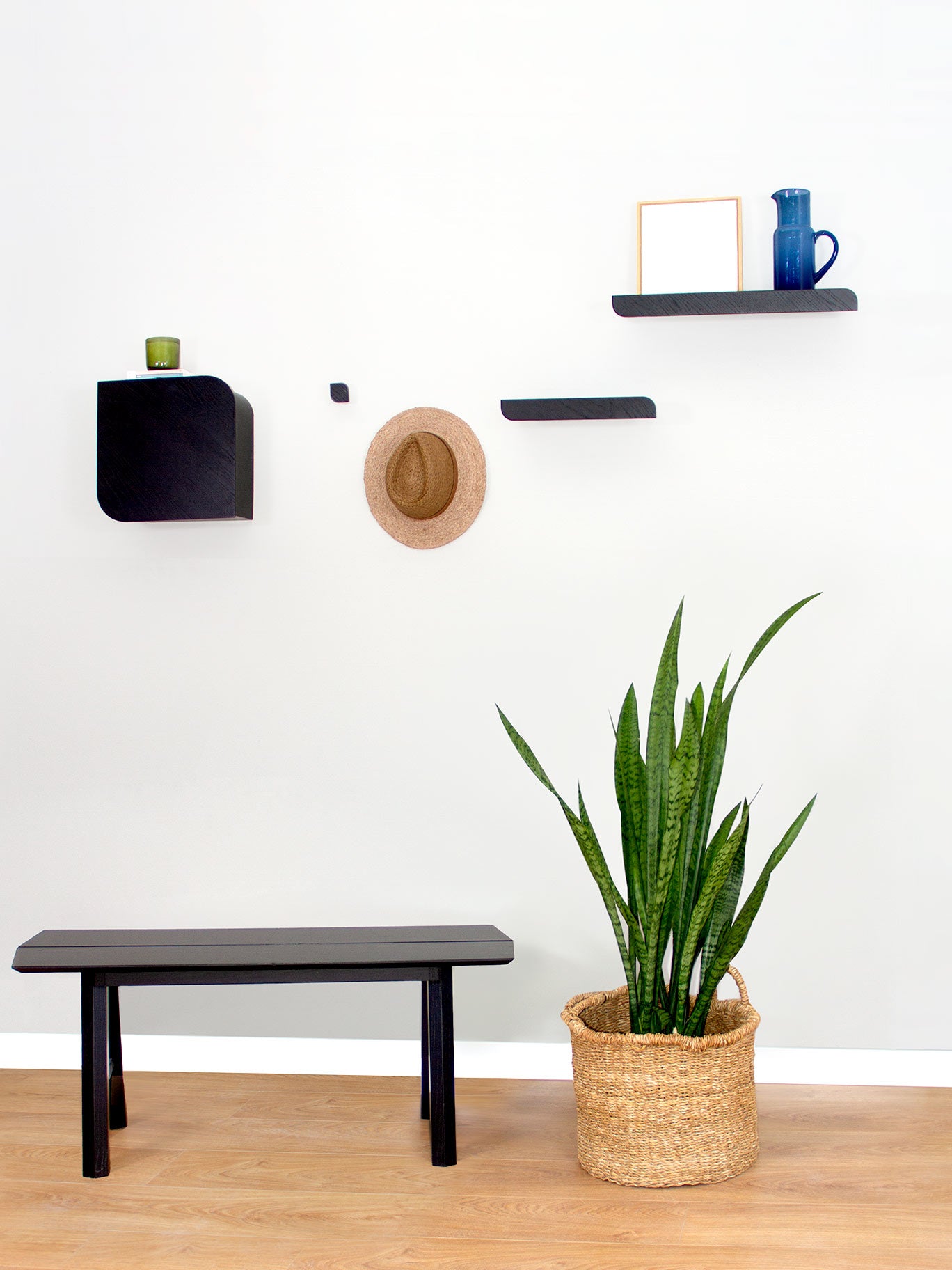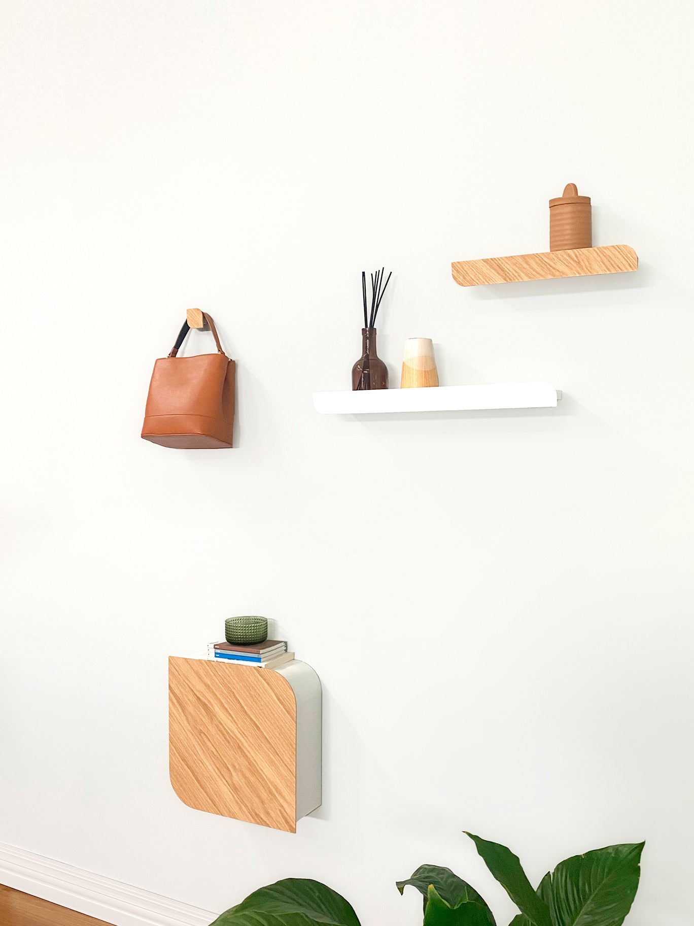 Carefully designed to work as a composition, Cielo consists of three types of pieces: a shelf (available in three different sizes), a set of hooks, and a wall cabinet. These pieces come together to create a balanced and harmonious combination that quickly enhances any space and brings nature inside.