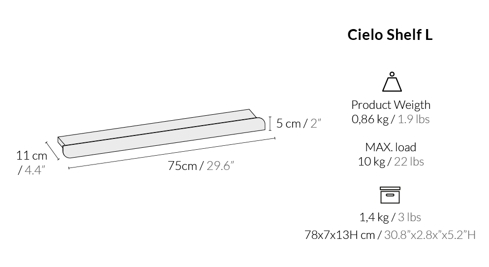 In the Cielo Shelf, this space is 10cm wide (4 in), meaning that all objects under this size will fit perfectly on top of it.