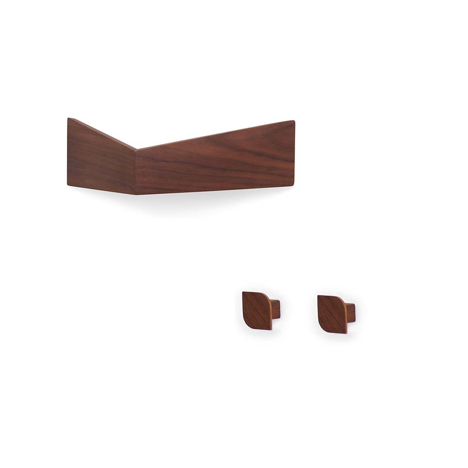 Pelican S Wall Shelf and two Cielo Wall Hooks · Walnut