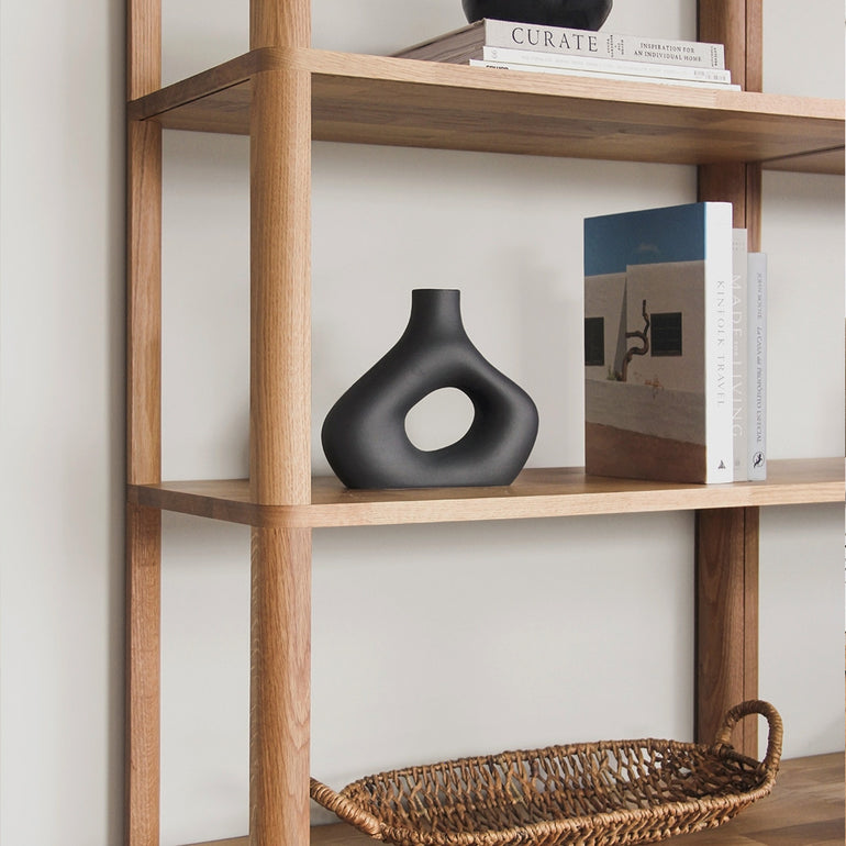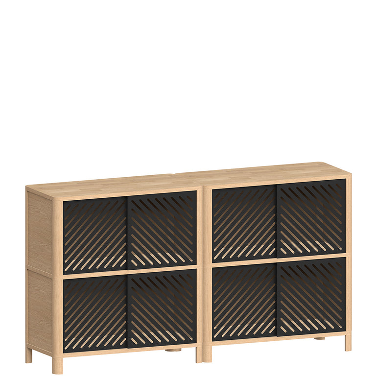 Side and back panels of the closed modules: MDF fiber with natural Oak wood veneer.