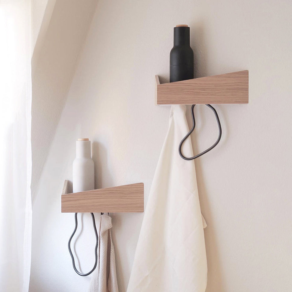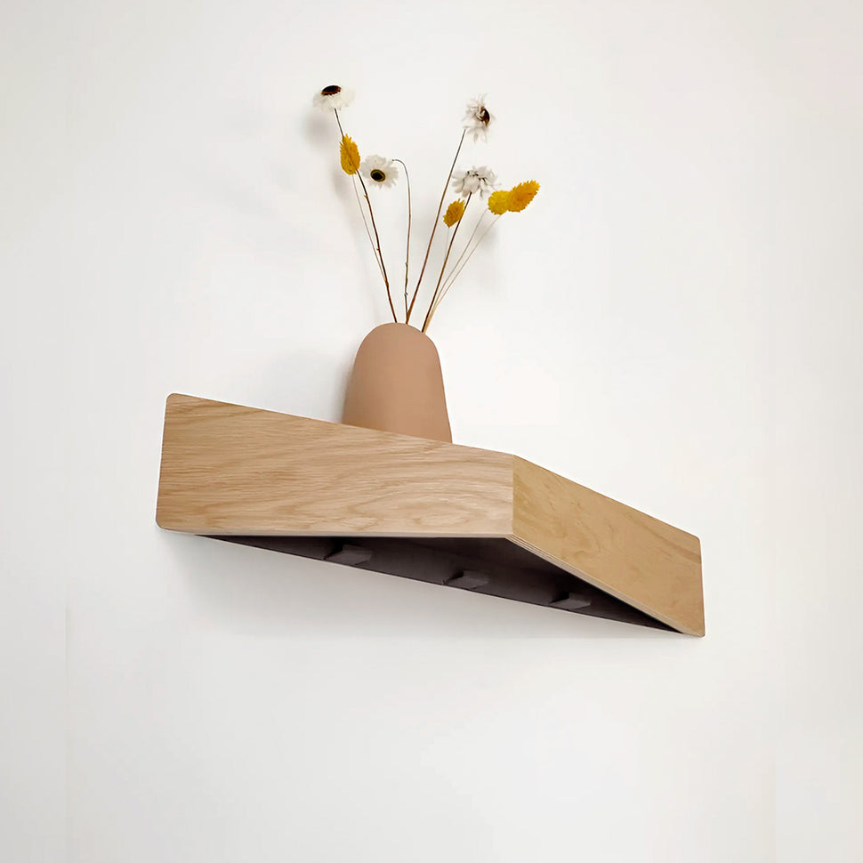 Pelican’s hidden hooks are anchored to the wall through the same metal piece that supports the whole wood structure of the shelf. These hooks are made out of folded steel 2mm deep and are extra strong, allowing you to hang up to 30kg on weight.