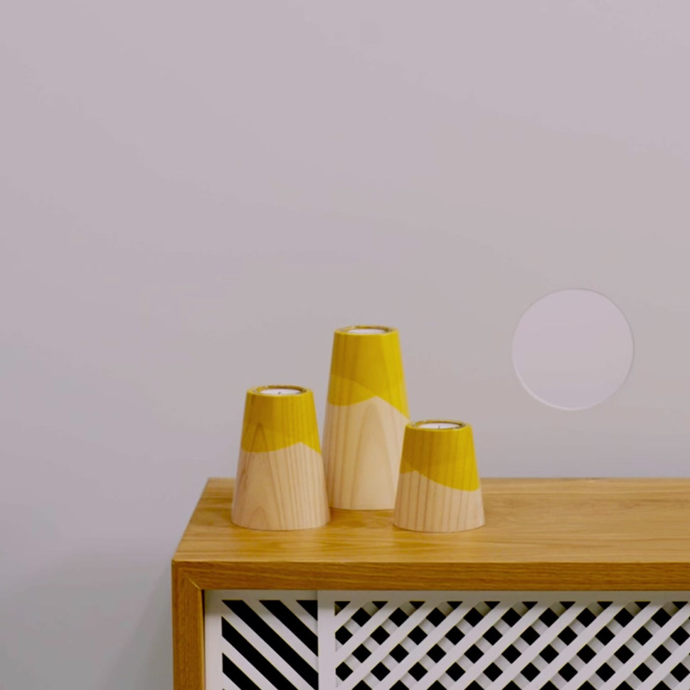 Its translucency highlights the natural tonalities of the wood giving the product elegance and personality. Also, this wooden candle holders collection is available in sets of three pieces and in a palette of six different. All of these colors were carefully chosen to fit in any decor design and minimalist space.