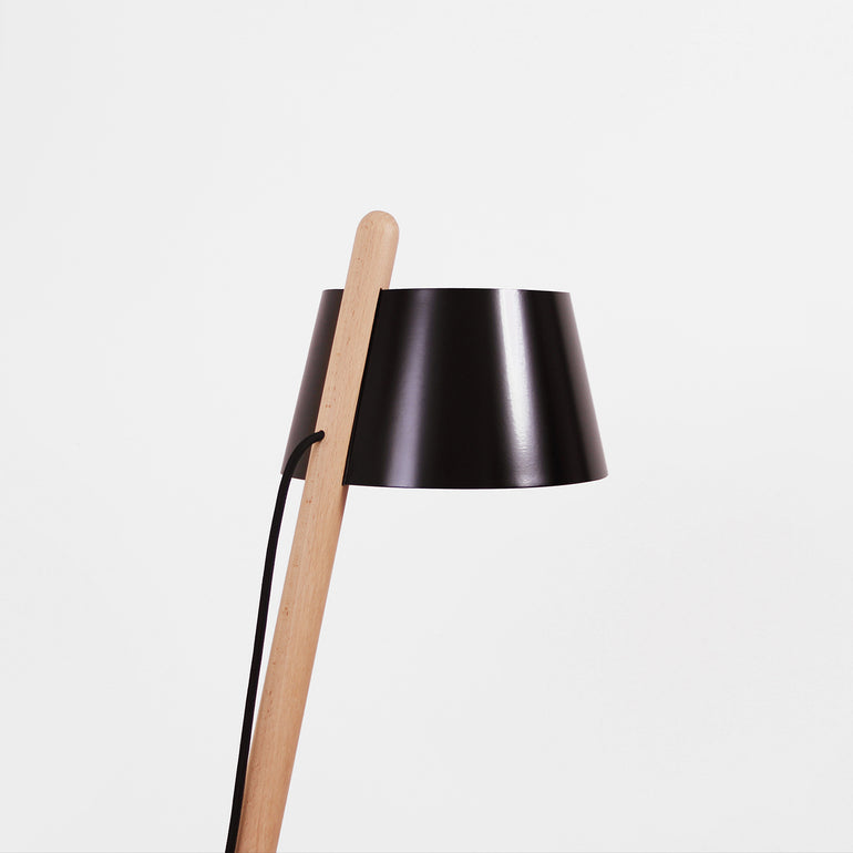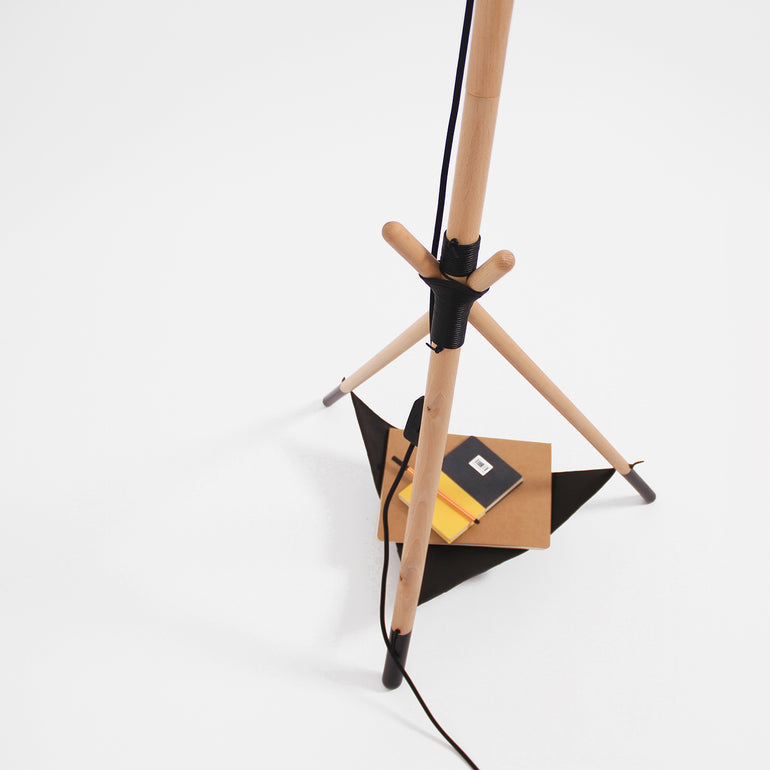 Its elegant and simple lines are drawn from a sophisticated structure of cylindrical slats of beech wood in the shape of a tripod. Finally, these pieces are joined together by an elegant leather cord. Also, at the top of the mast there is a small metal screen that radiates a direct light ideal for reading your favorite book or magazine.