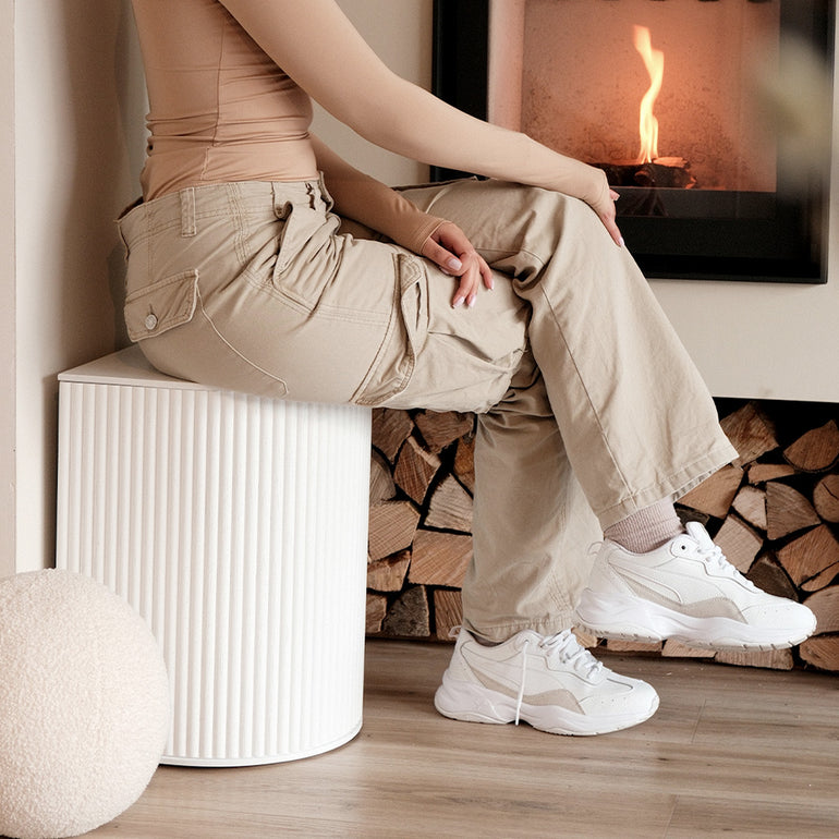 A shifting stool with the possibility of being used as a seat, including a storage space perfect for blankets or books. With an iconic texture that makes an automatic statement piece that completes a room with a memorable look. And even more functional, with its design perfectly connecting giving the possibility of connecting two stools in the center and creating a side or center table.