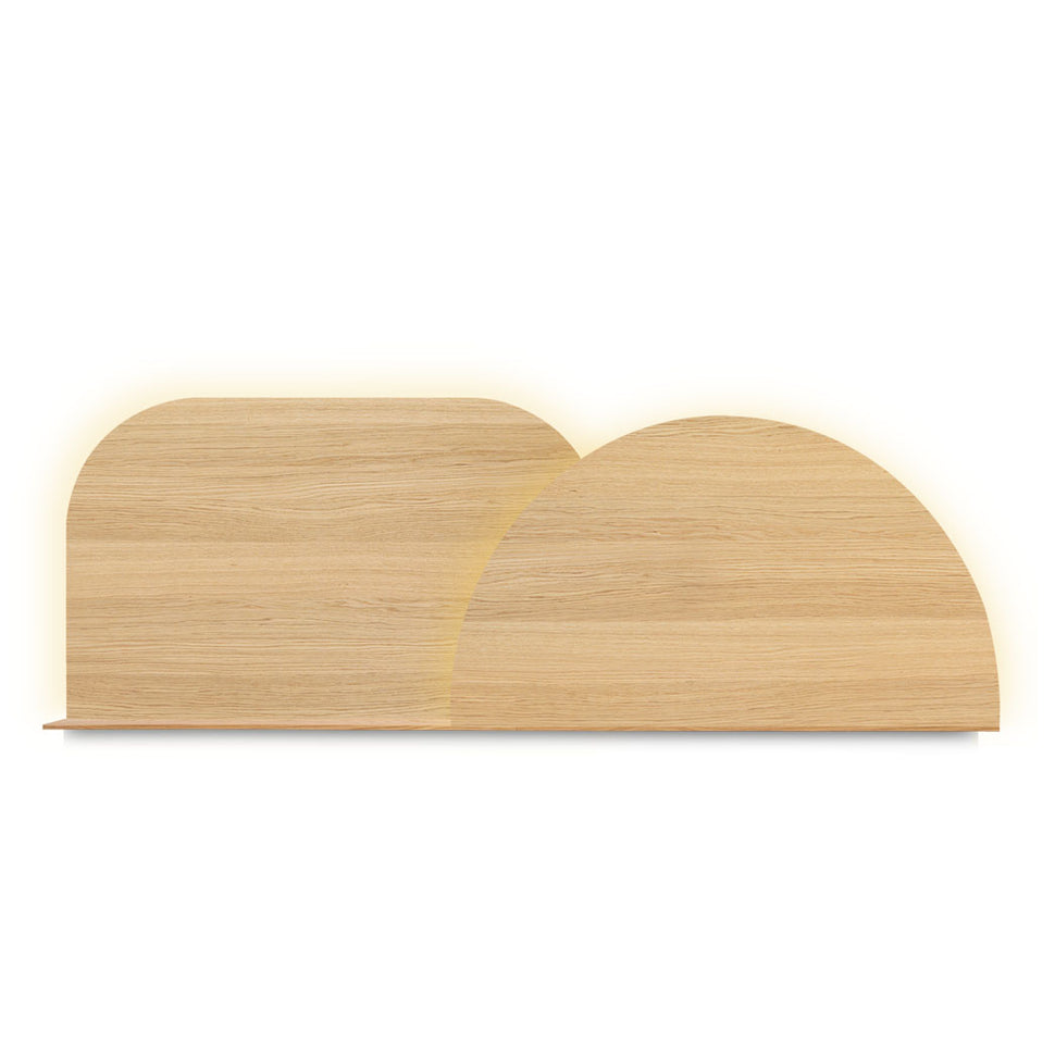 Our Alba Headboard consists of two panels that overlap in the center, available in either sustainable wood finish or beautiful textile, and combined with a hidden shelf for small everyday items. Easily decide at home how to install them thanks to all panels being interchangeable. The piece is completed with the possibility to add minimalistic dimmable backlighting.
