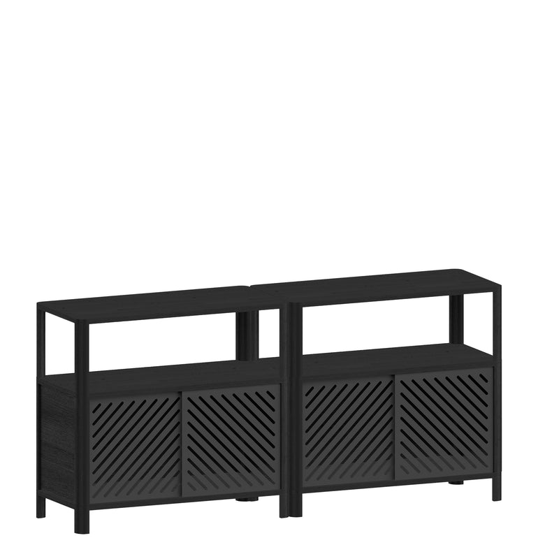 Three horizontal modules available in two different heights. A closed high module that allows to add doors, an open high module without doors, and an open short module.