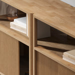 Side and back panels of the closed modules: MDF fiber with natural Oak wood veneer.