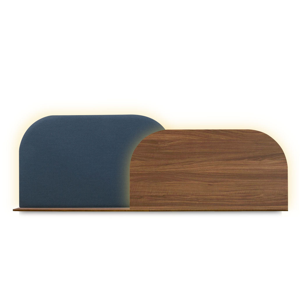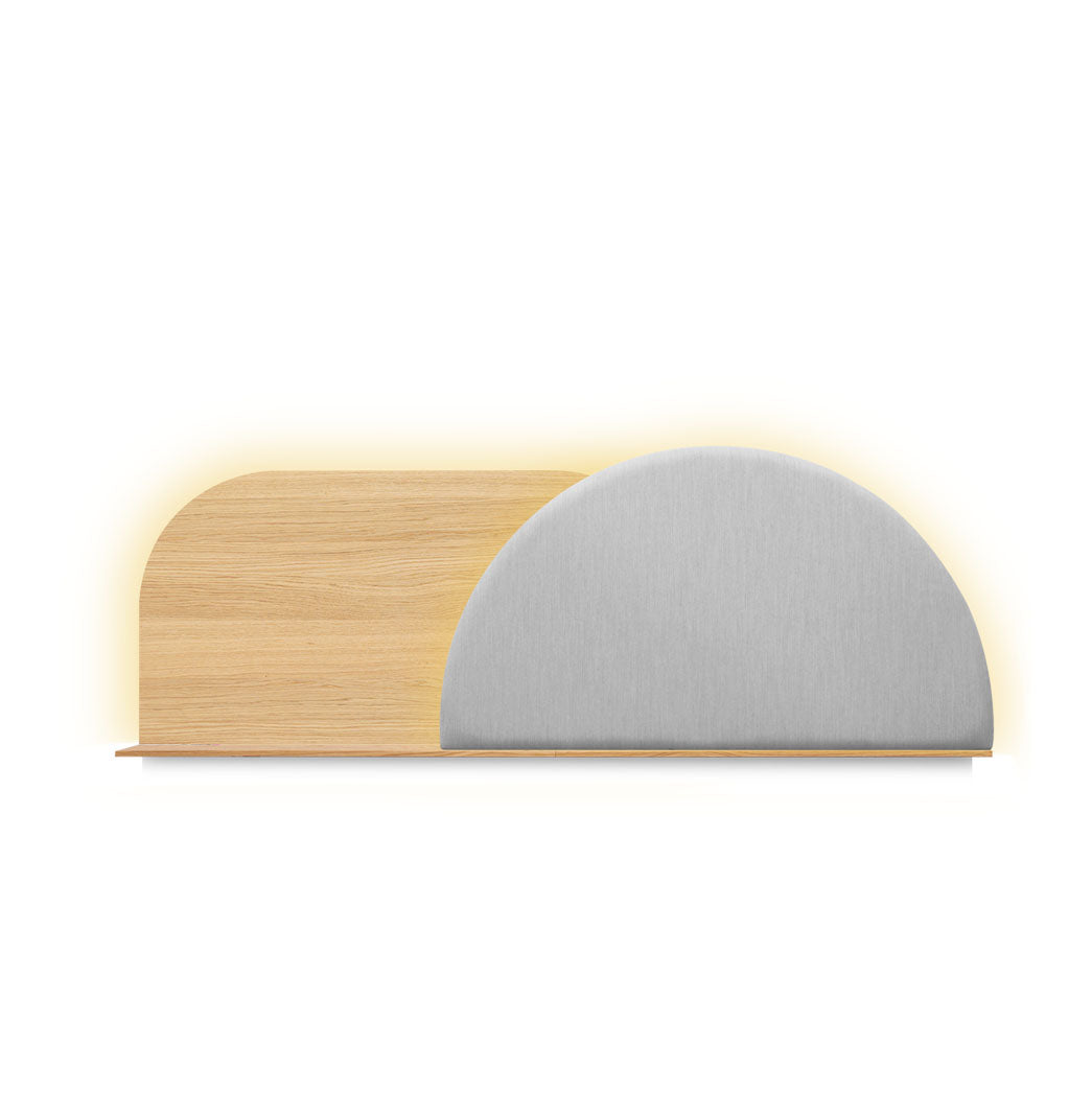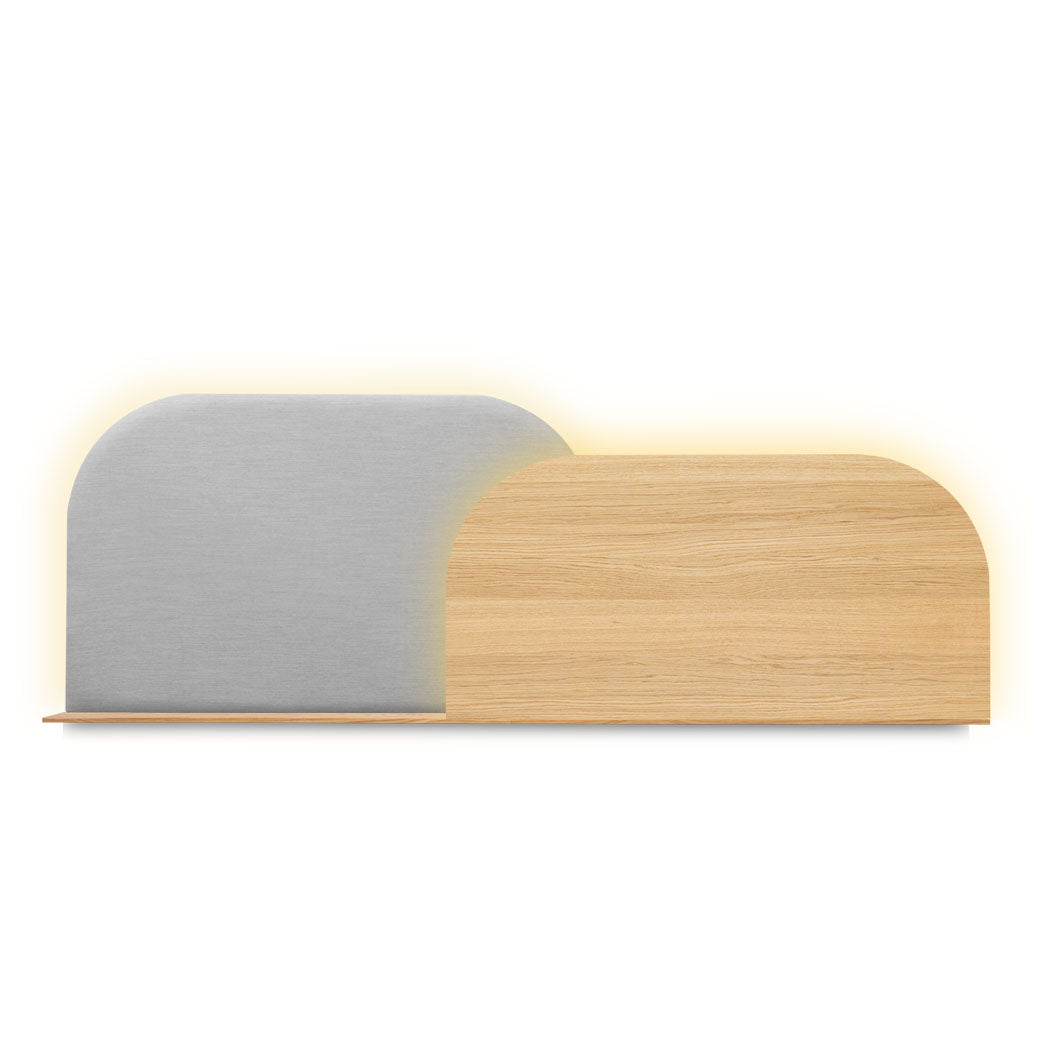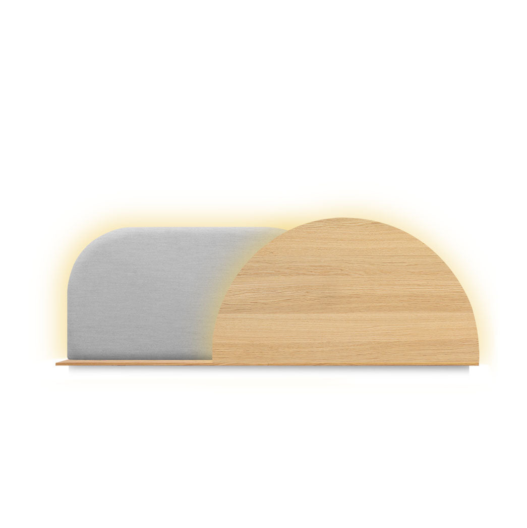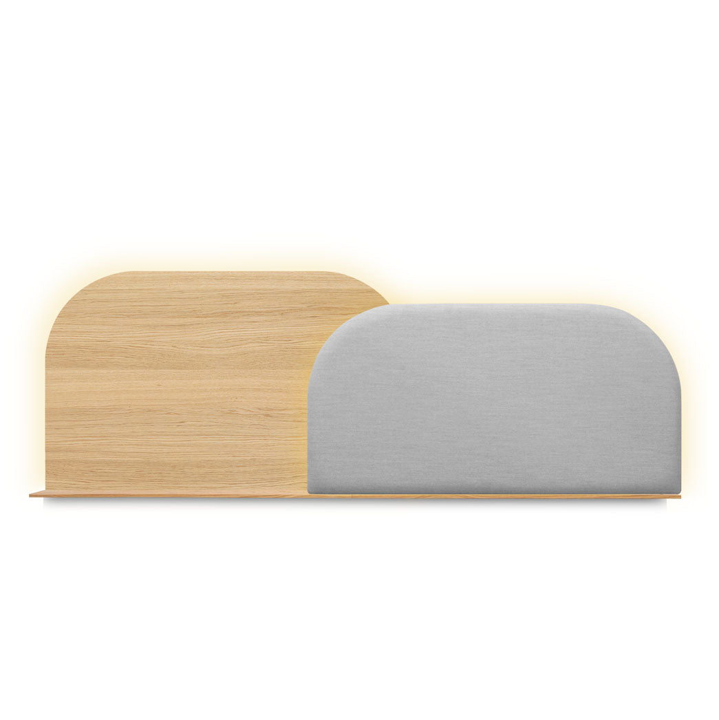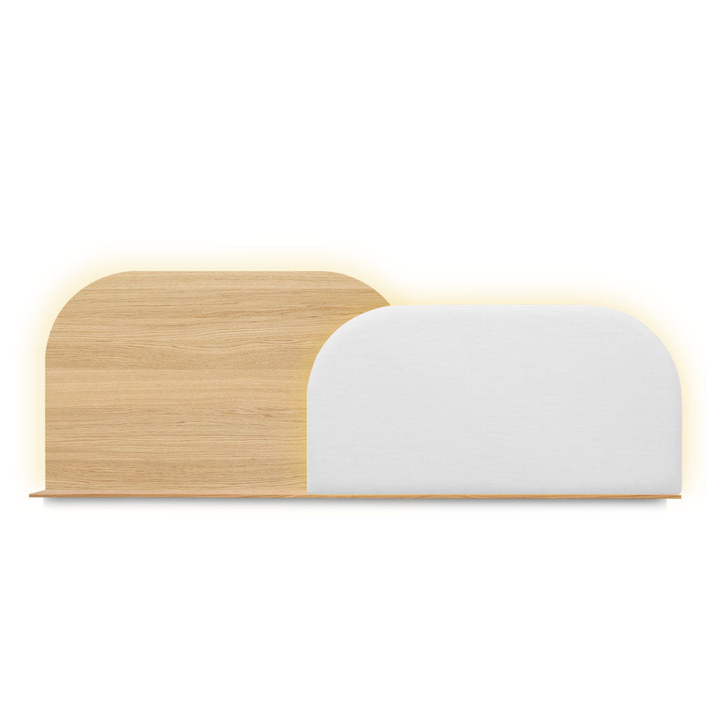 Nuestro Cabecero Alba consta de dos paneles que se superponen en el centro, disponibles en acabado de madera sostenible o hermoso textil, y combinados con un estante oculto para pequeños objetos cotidianos. Decida fácilmente en casa cómo instalarlos gracias a que todos los paneles son intercambiables. La pieza se completa con la posibilidad de añadir iluminación de fondo minimalista y regulable.