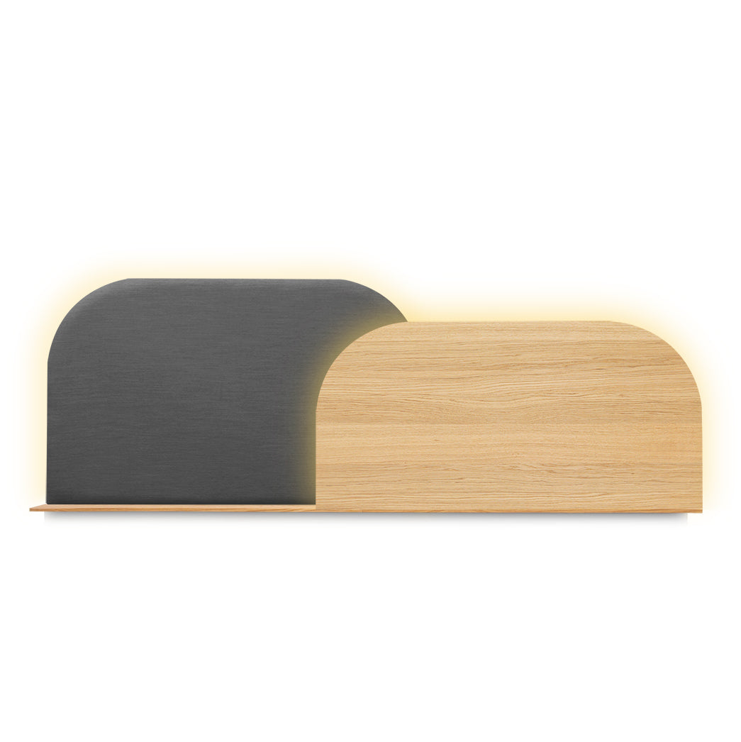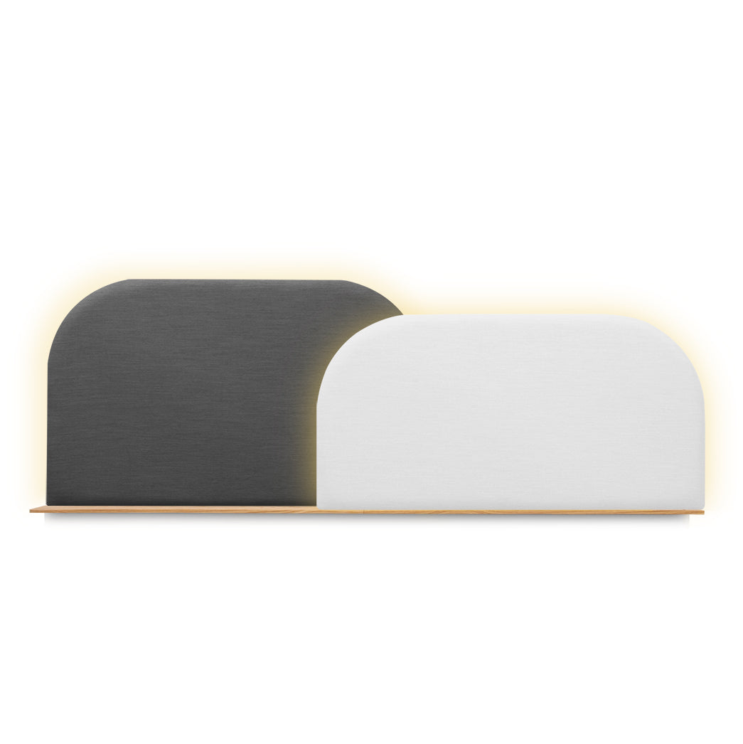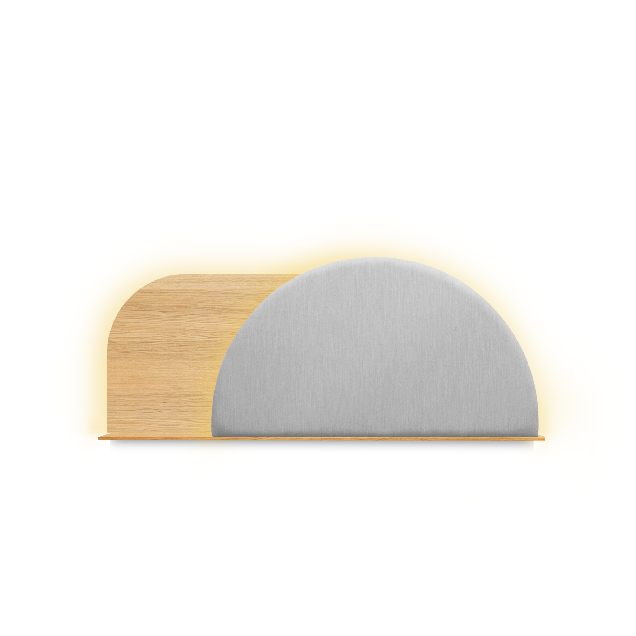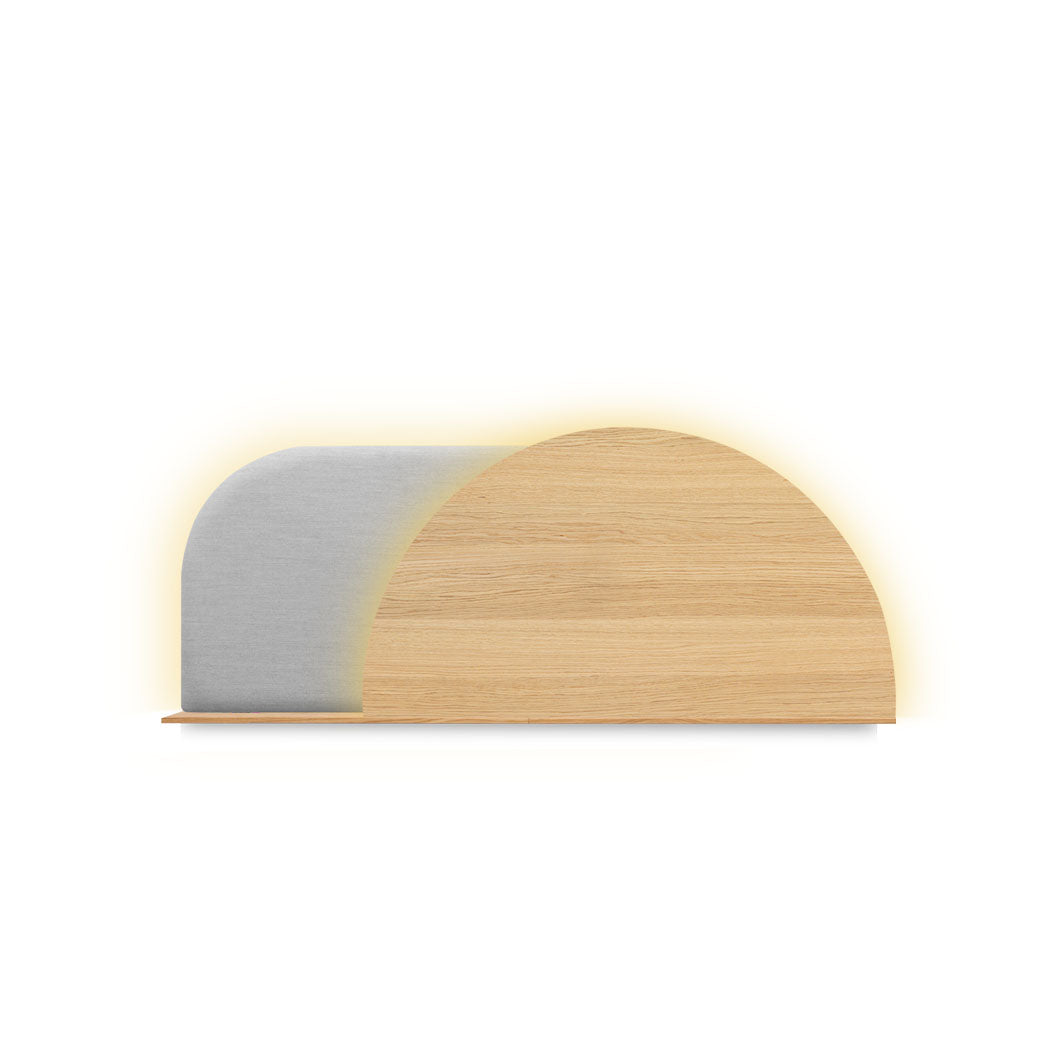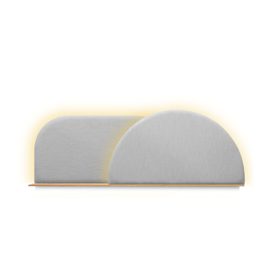 Nuestro Cabecero Alba consta de dos paneles que se superponen en el centro, disponibles en acabado de madera sostenible o hermoso textil, y combinados con un estante oculto para pequeños objetos cotidianos. Decida fácilmente en casa cómo instalarlos gracias a que todos los paneles son intercambiables. La pieza se completa con la posibilidad de añadir iluminación de fondo minimalista y regulable.