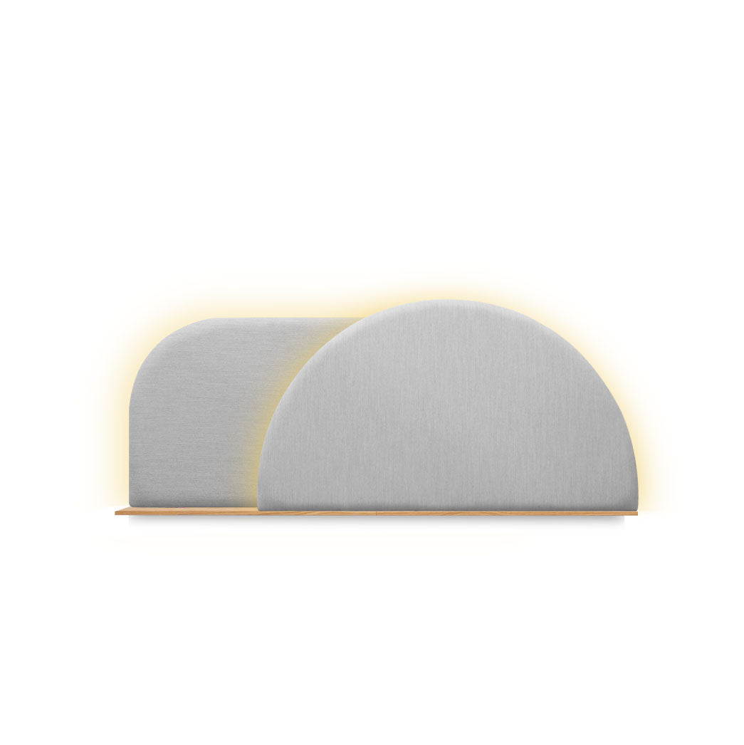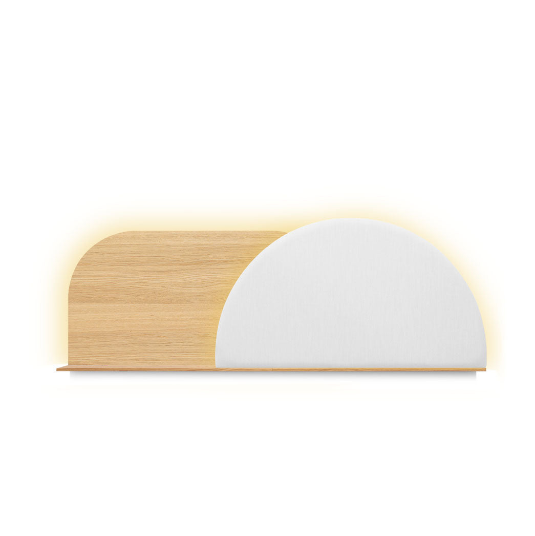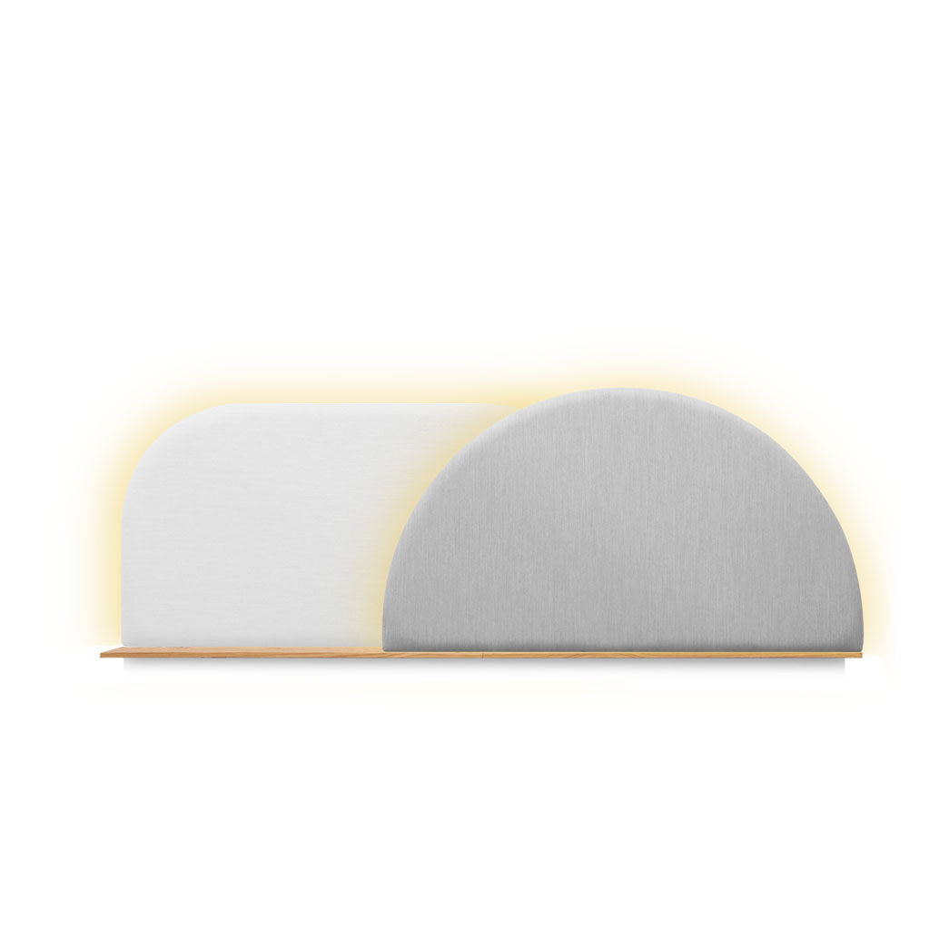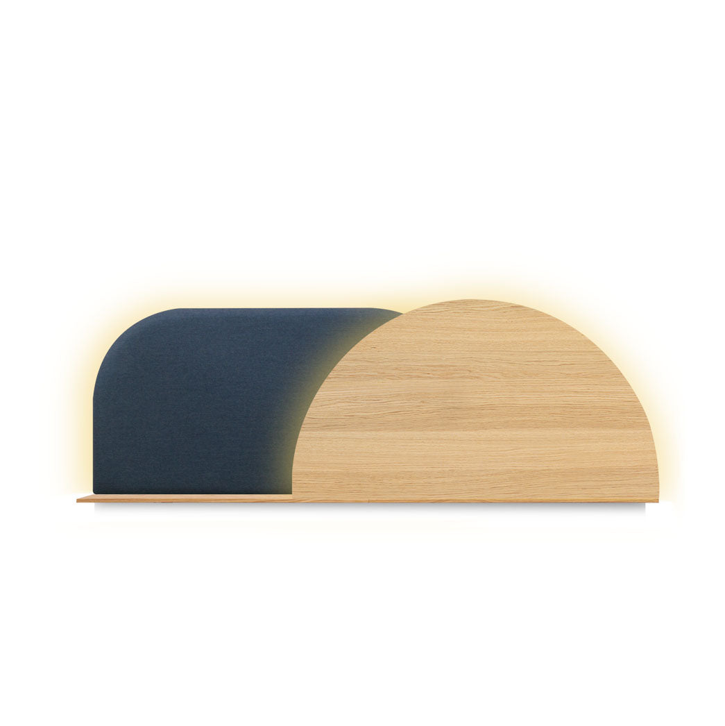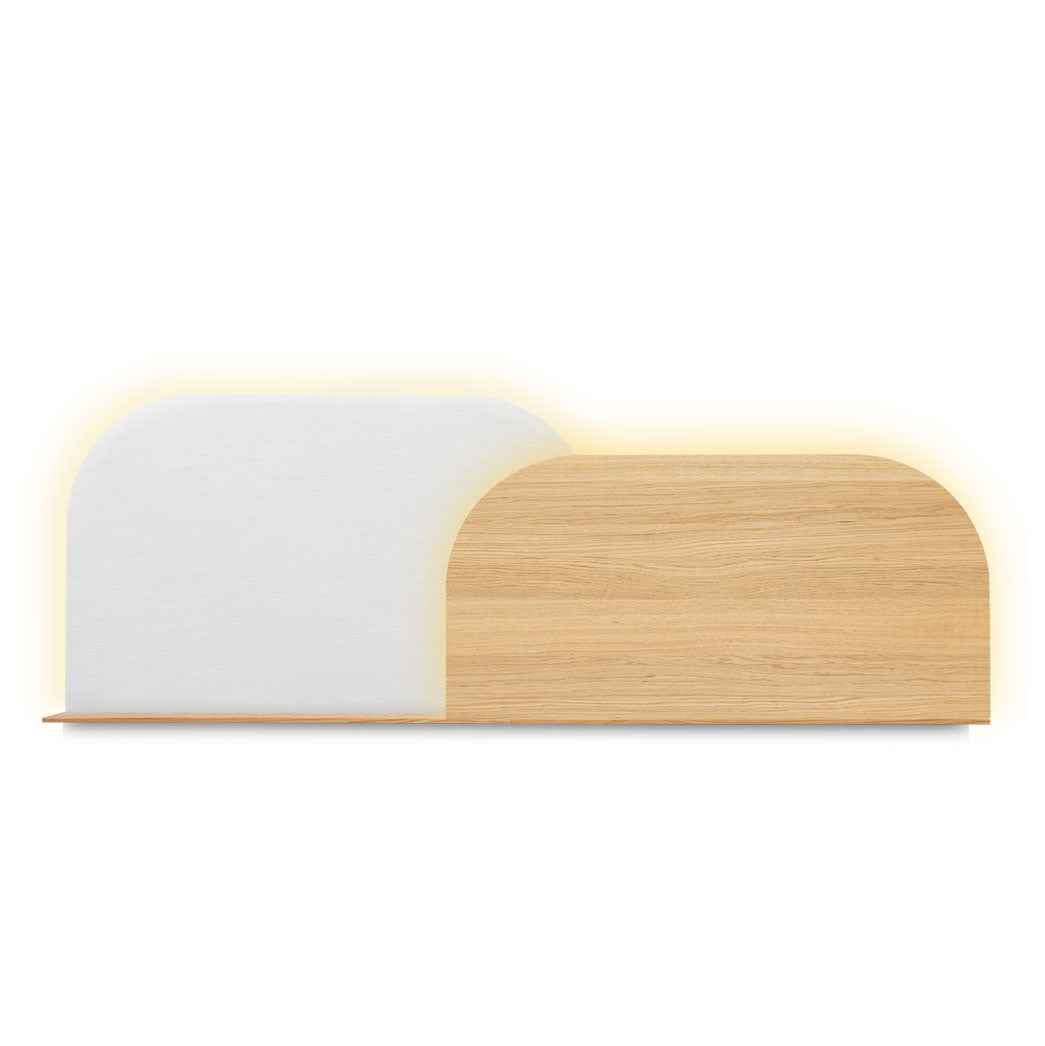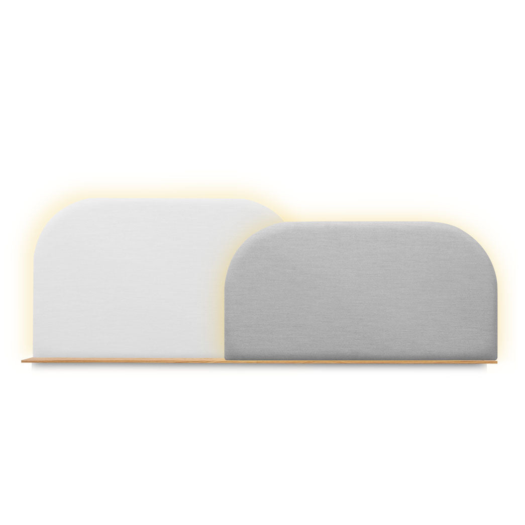 Nuestro Cabecero Alba consta de dos paneles que se superponen en el centro, disponibles en acabado de madera sostenible o hermoso textil, y combinados con un estante oculto para pequeños objetos cotidianos. Decida fácilmente en casa cómo instalarlos gracias a que todos los paneles son intercambiables. La pieza se completa con la posibilidad de añadir iluminación de fondo minimalista y regulable.