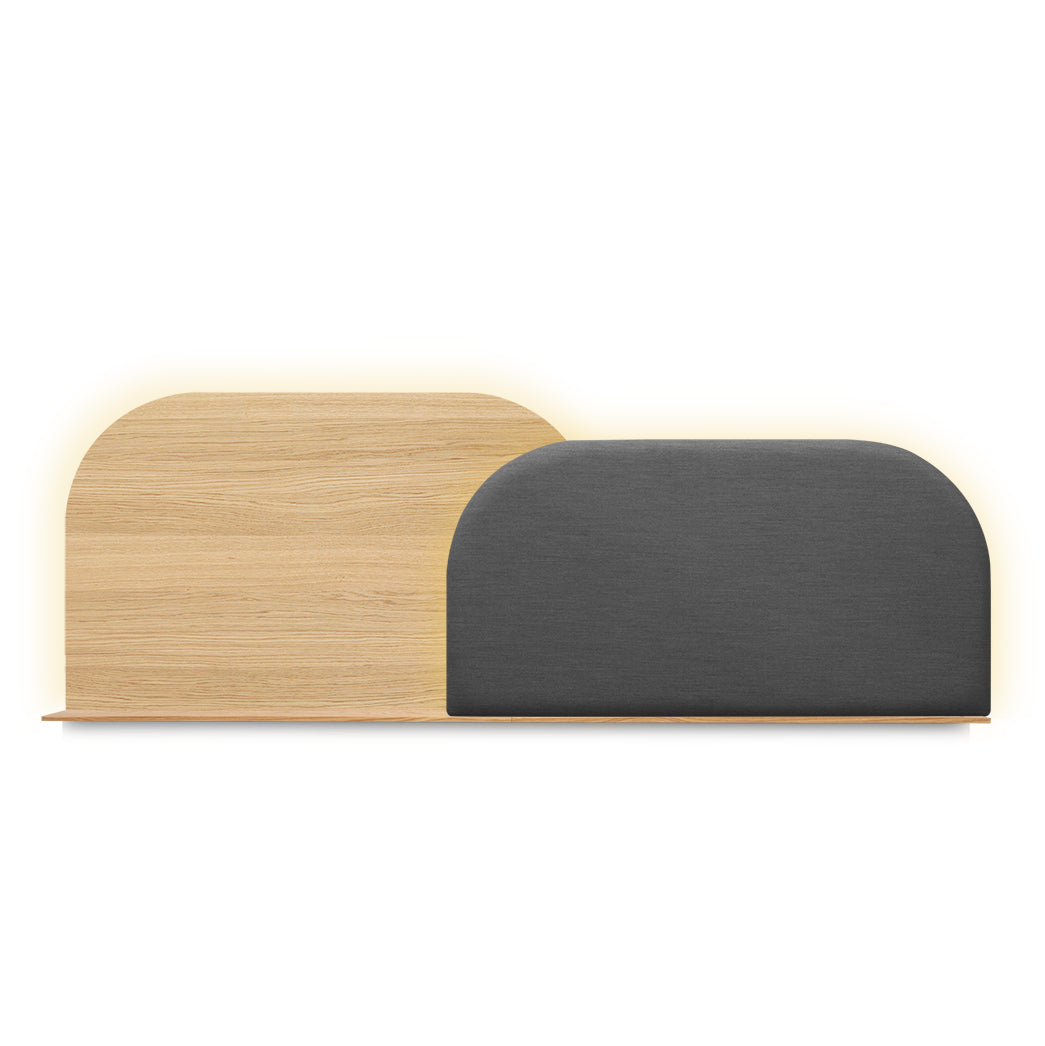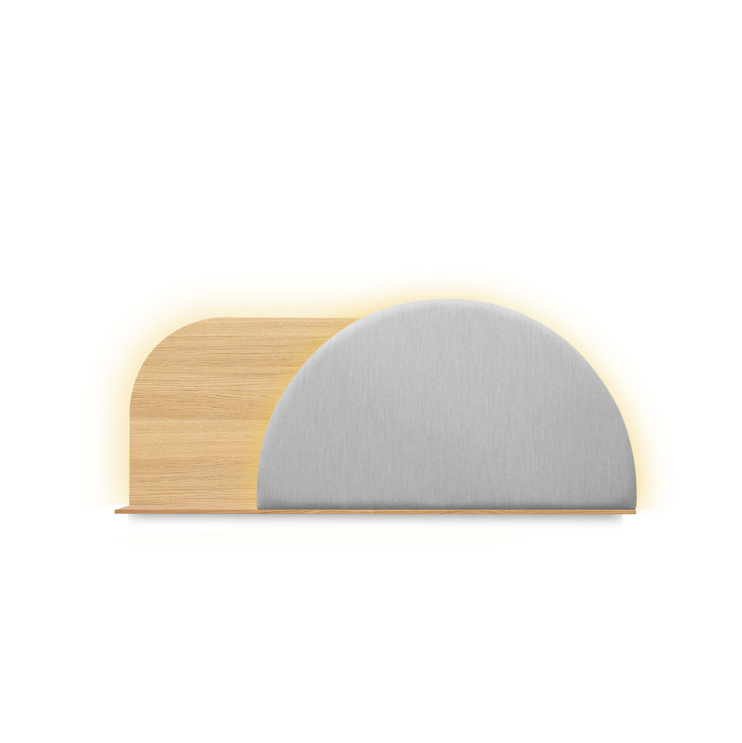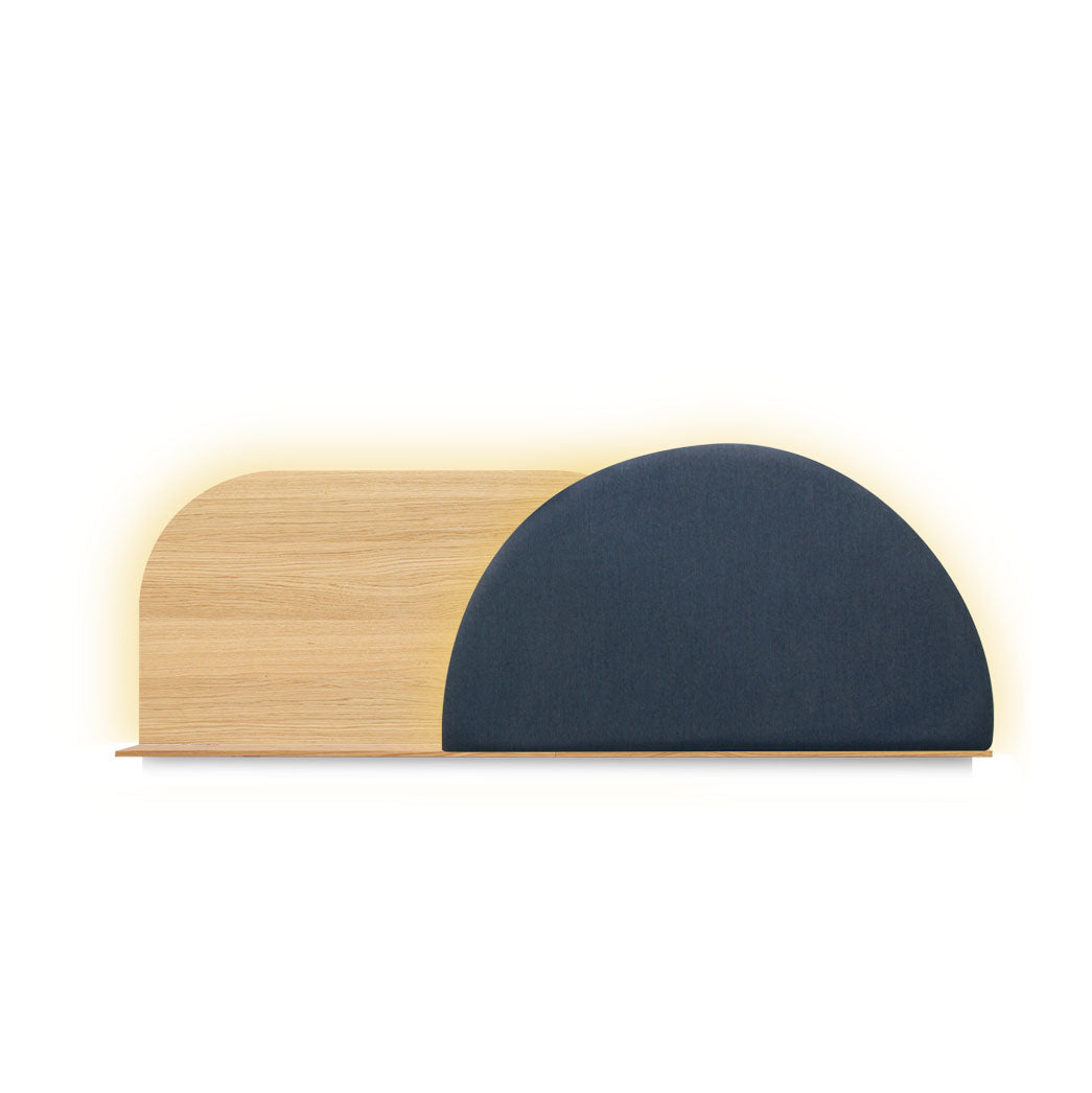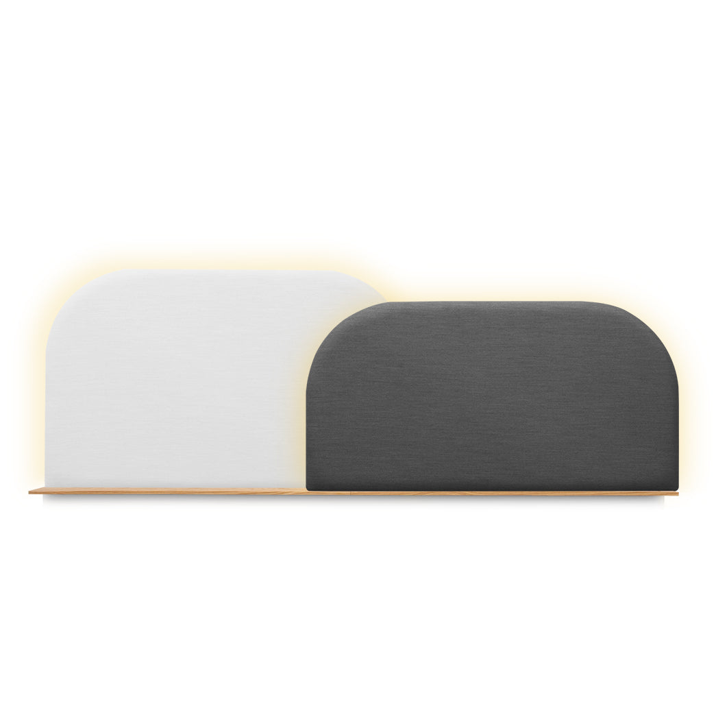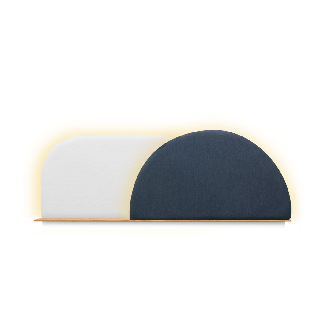Nuestro Cabecero Alba consta de dos paneles que se superponen en el centro, disponibles en acabado de madera sostenible o hermoso textil, y combinados con un estante oculto para pequeños objetos cotidianos. Decida fácilmente en casa cómo instalarlos gracias a que todos los paneles son intercambiables. La pieza se completa con la posibilidad de añadir iluminación de fondo minimalista y regulable.