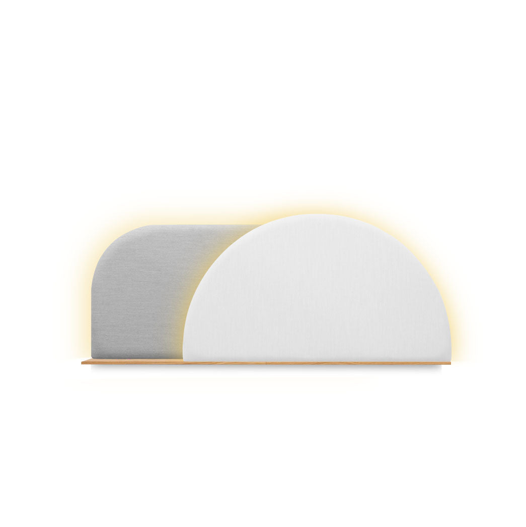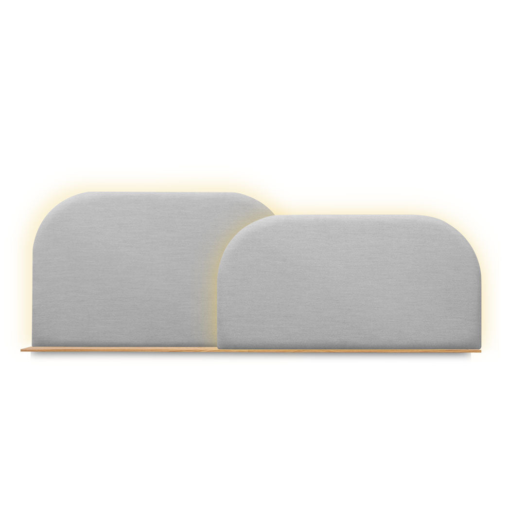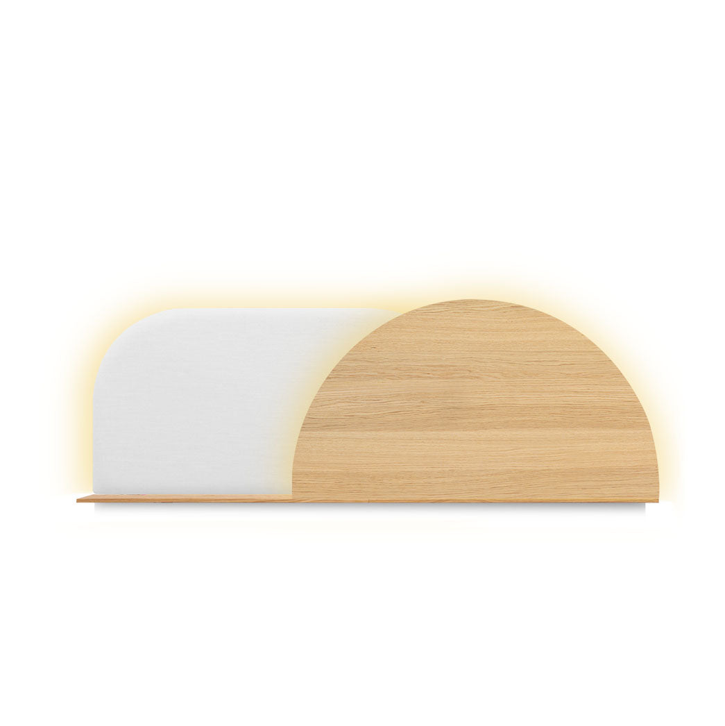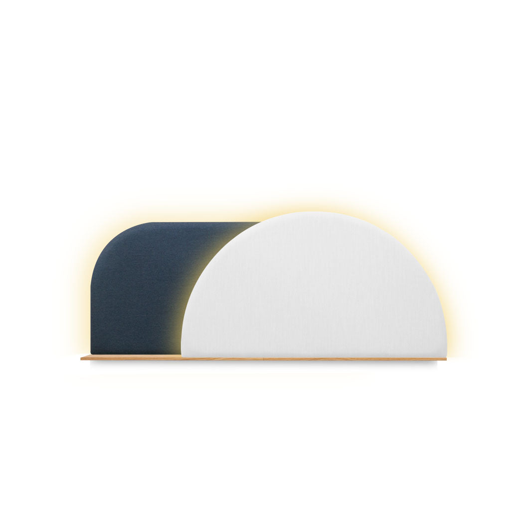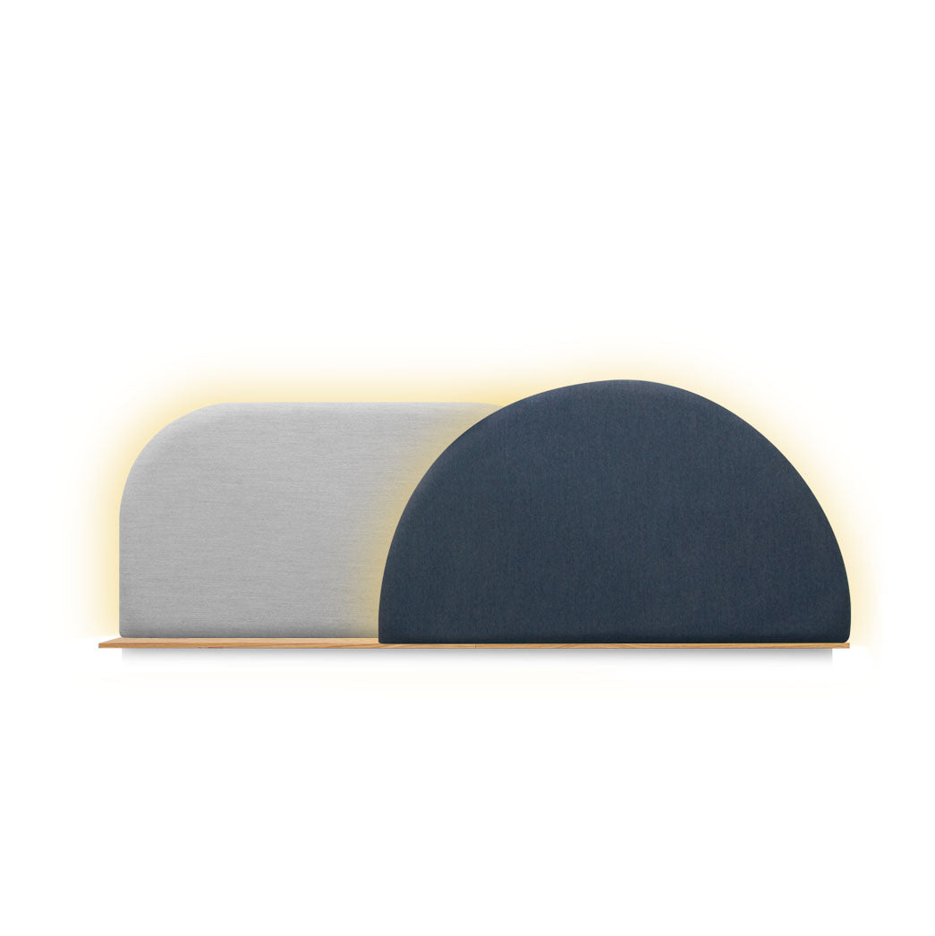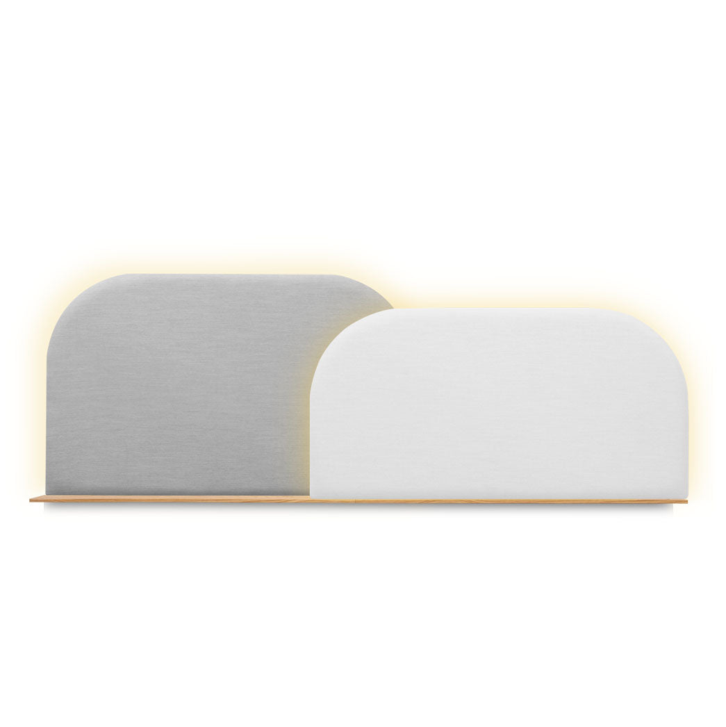 Nuestro Cabecero Alba consta de dos paneles que se superponen en el centro, disponibles en acabado de madera sostenible o hermoso textil, y combinados con un estante oculto para pequeños objetos cotidianos. Decida fácilmente en casa cómo instalarlos gracias a que todos los paneles son intercambiables. La pieza se completa con la posibilidad de añadir iluminación de fondo minimalista y regulable.