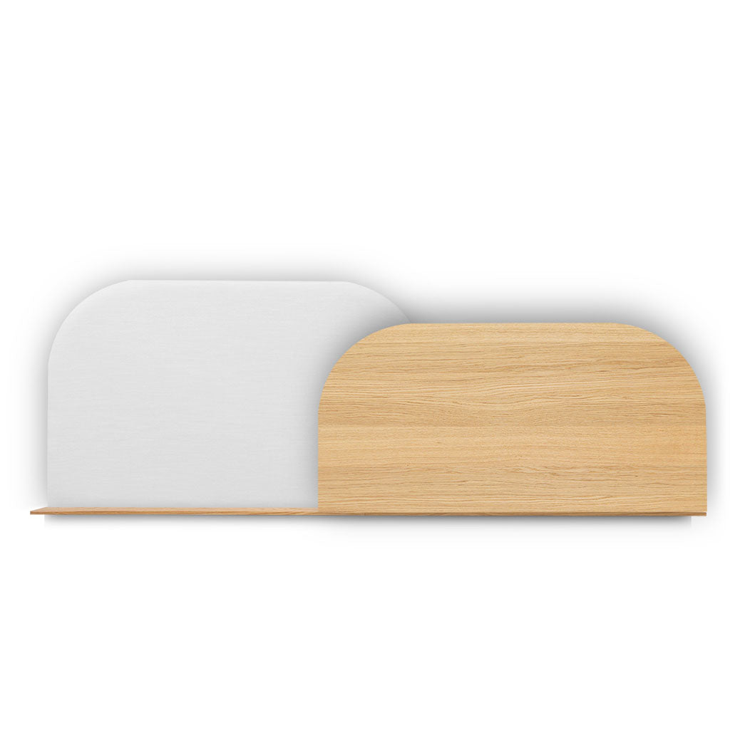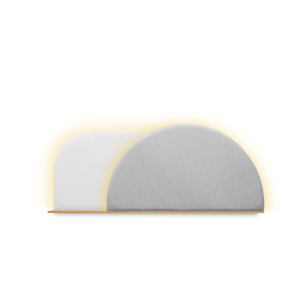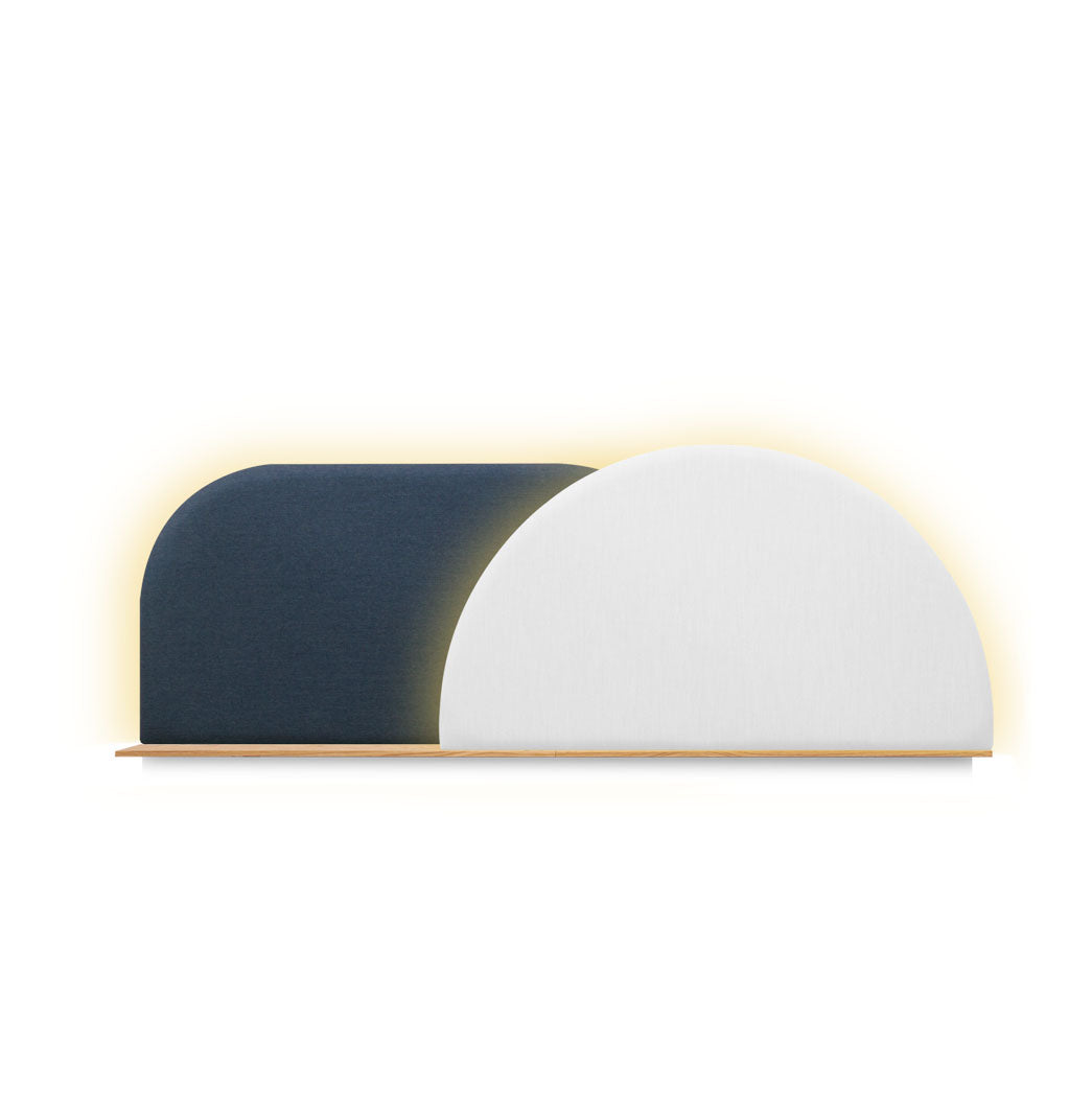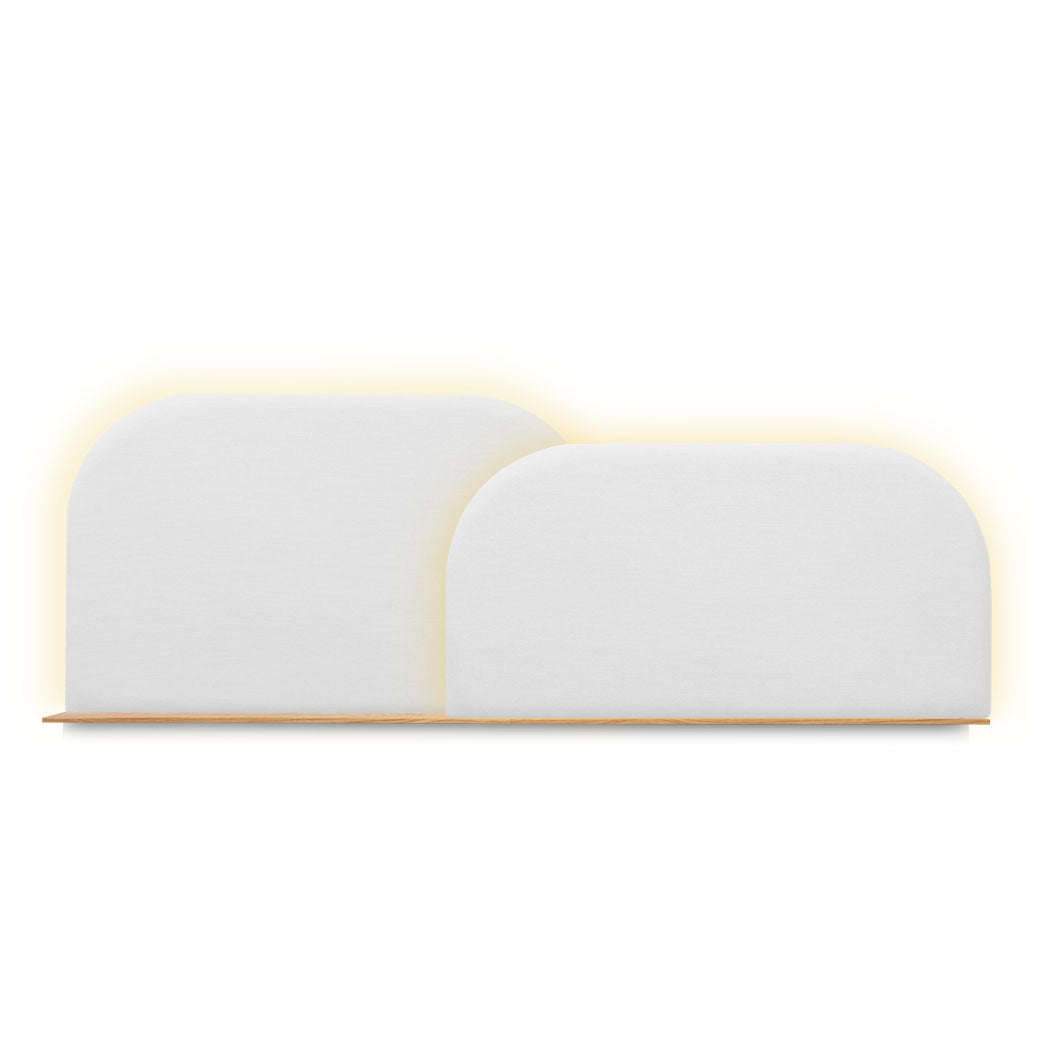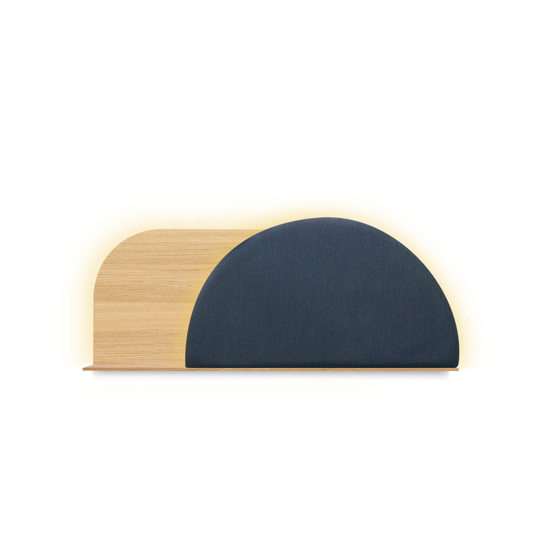 Nuestro Cabecero Alba consta de dos paneles que se superponen en el centro, disponibles en acabado de madera sostenible o hermoso textil, y combinados con un estante oculto para pequeños objetos cotidianos. Decida fácilmente en casa cómo instalarlos gracias a que todos los paneles son intercambiables. La pieza se completa con la posibilidad de añadir iluminación de fondo minimalista y regulable.