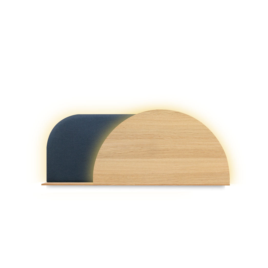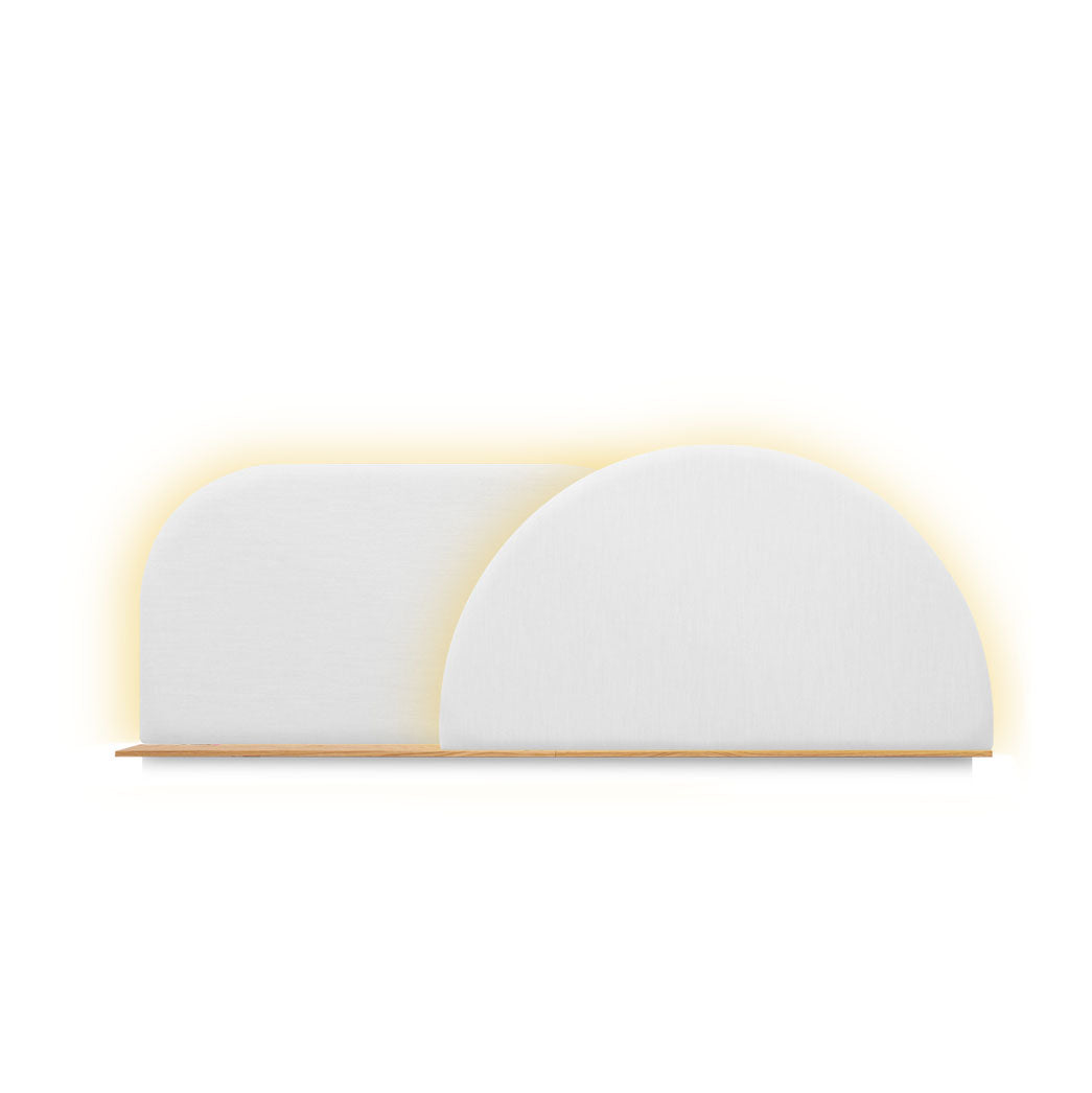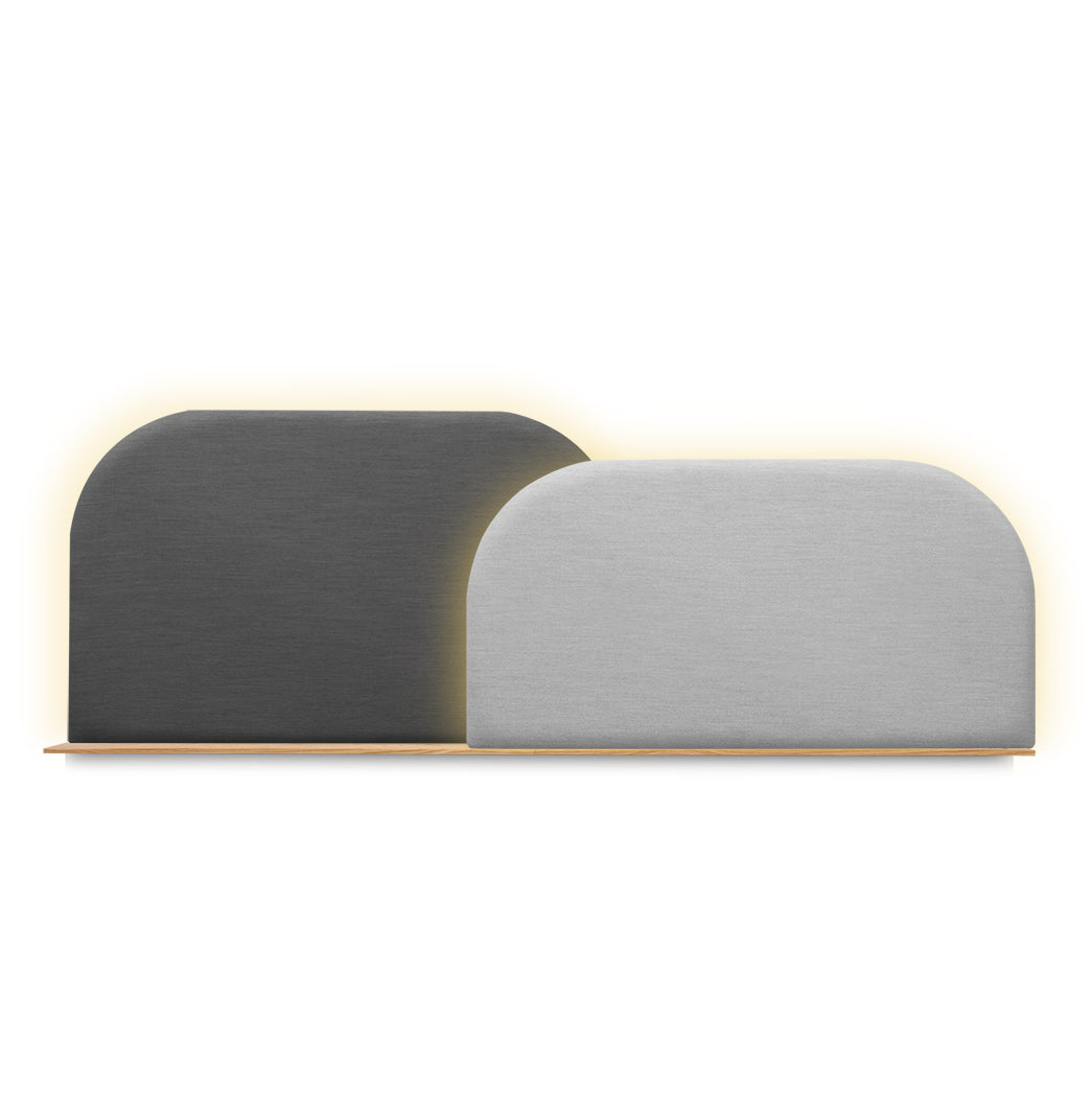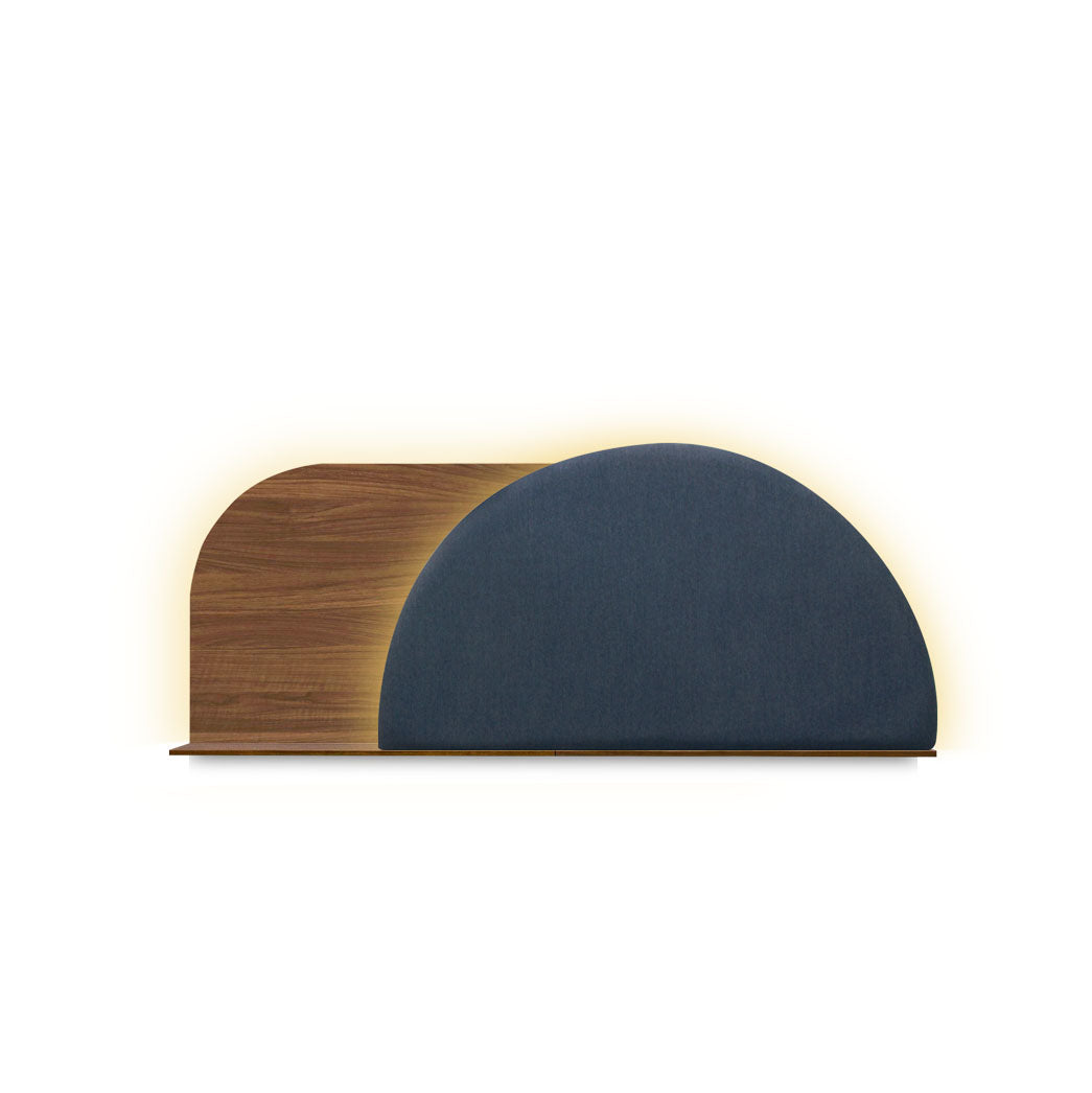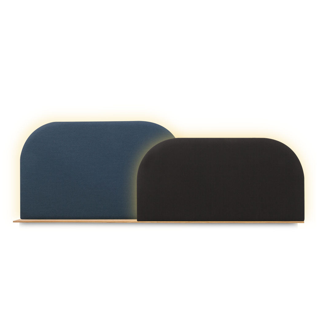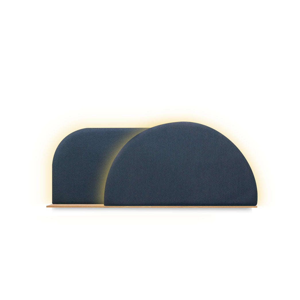 Nuestro Cabecero Alba consta de dos paneles que se superponen en el centro, disponibles en acabado de madera sostenible o hermoso textil, y combinados con un estante oculto para pequeños objetos cotidianos. Decida fácilmente en casa cómo instalarlos gracias a que todos los paneles son intercambiables. La pieza se completa con la posibilidad de añadir iluminación de fondo minimalista y regulable.