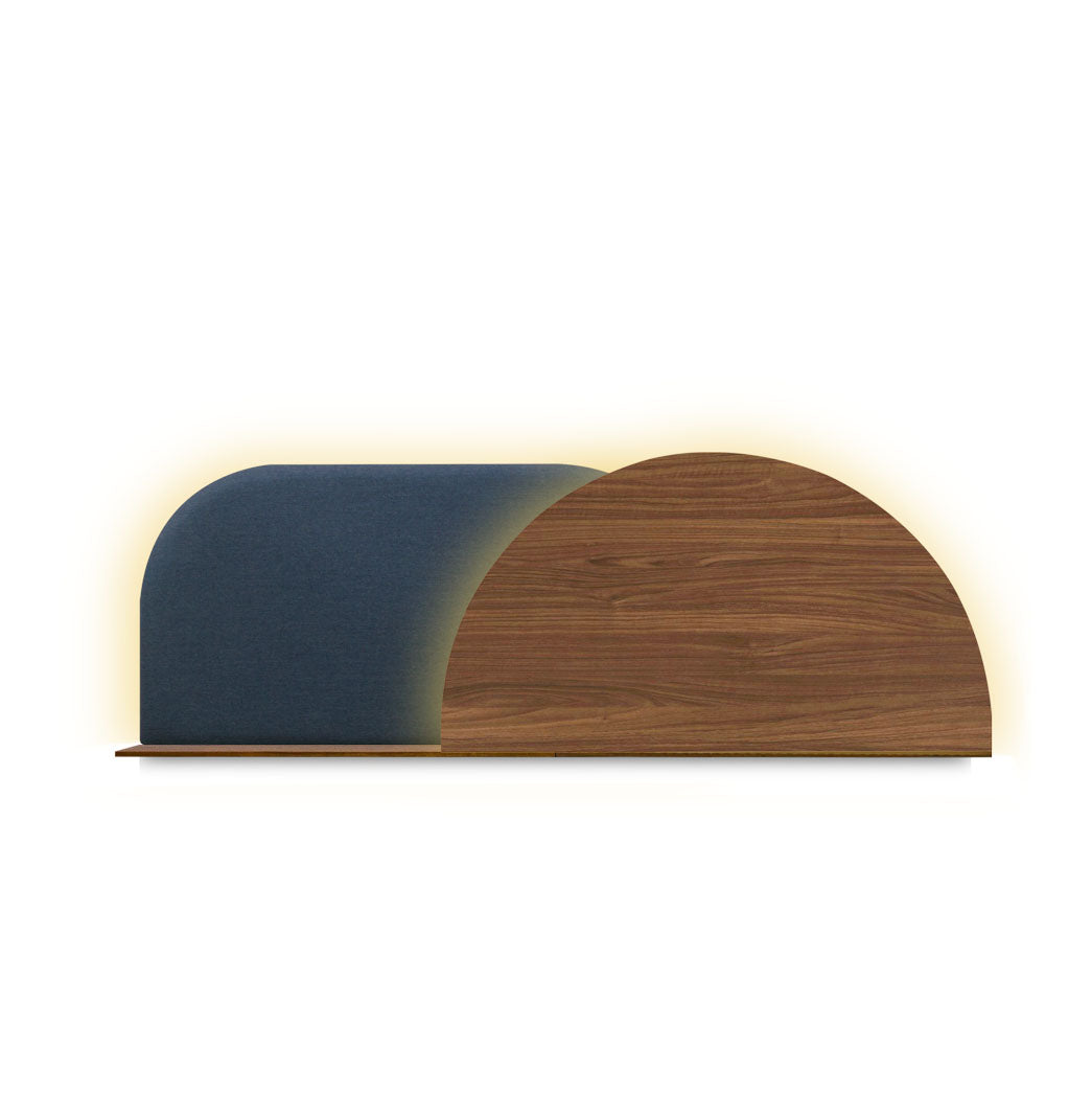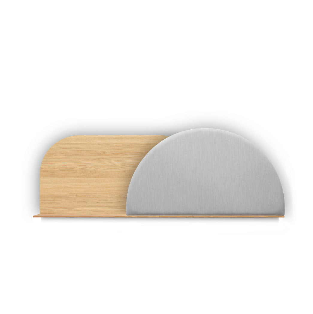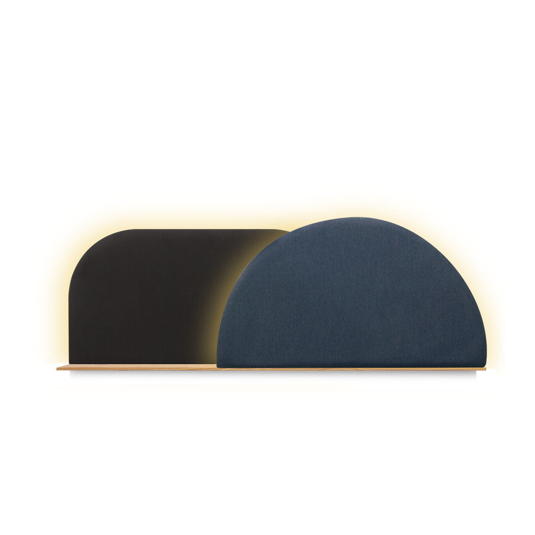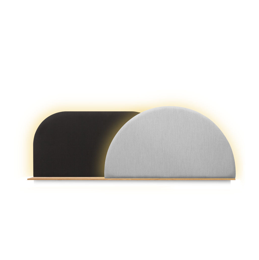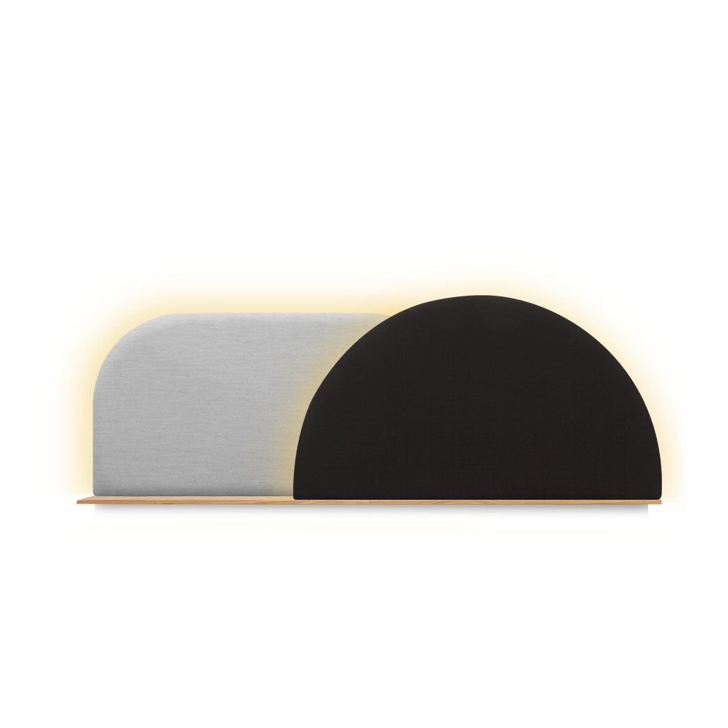 Nuestro Cabecero Alba consta de dos paneles que se superponen en el centro, disponibles en acabado de madera sostenible o hermoso textil, y combinados con un estante oculto para pequeños objetos cotidianos. Decida fácilmente en casa cómo instalarlos gracias a que todos los paneles son intercambiables. La pieza se completa con la posibilidad de añadir iluminación de fondo minimalista y regulable.