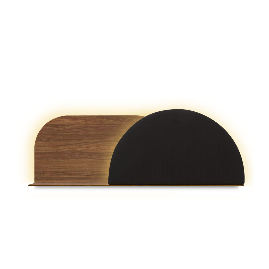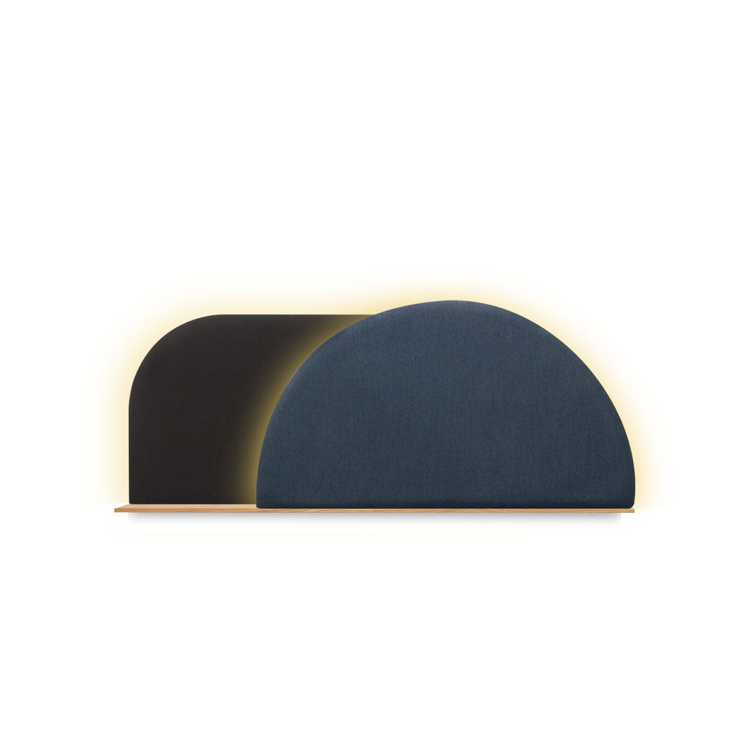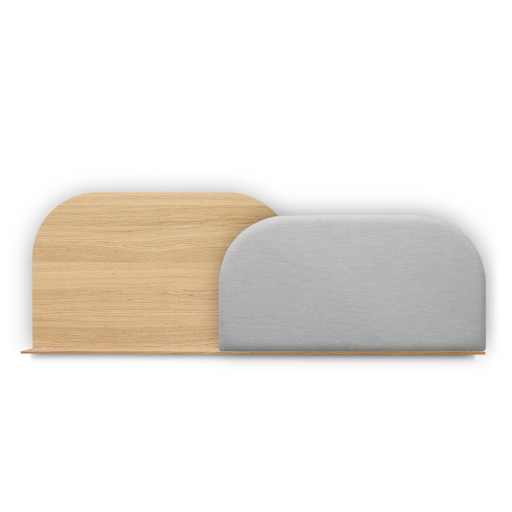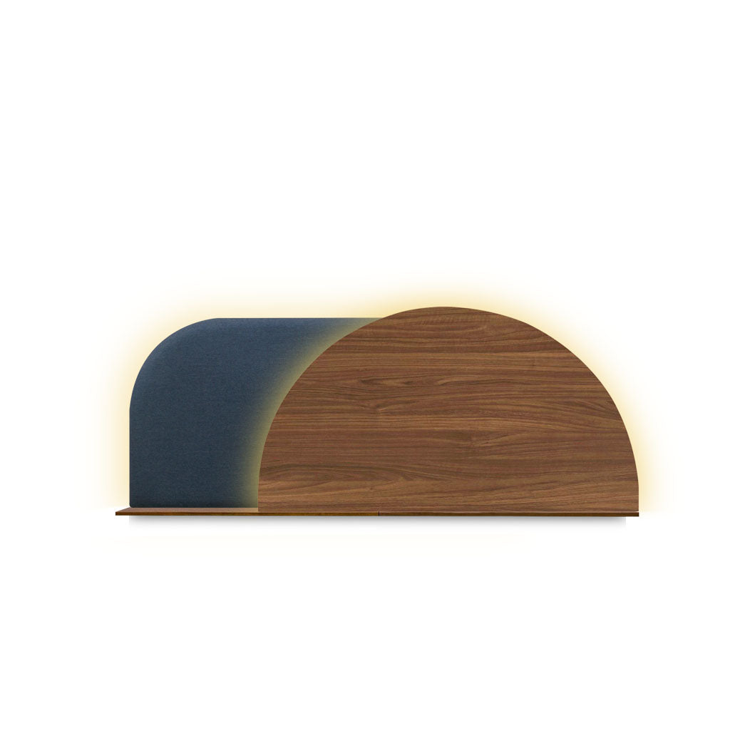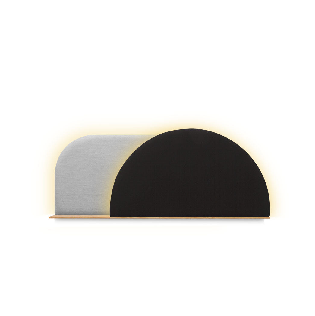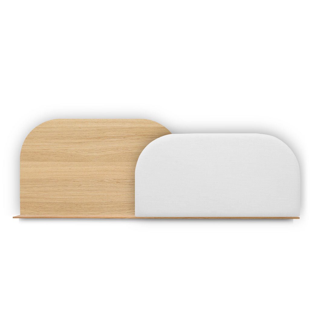 Nuestro Cabecero Alba consta de dos paneles que se superponen en el centro, disponibles en acabado de madera sostenible o hermoso textil, y combinados con un estante oculto para pequeños objetos cotidianos. Decida fácilmente en casa cómo instalarlos gracias a que todos los paneles son intercambiables. La pieza se completa con la posibilidad de añadir iluminación de fondo minimalista y regulable.