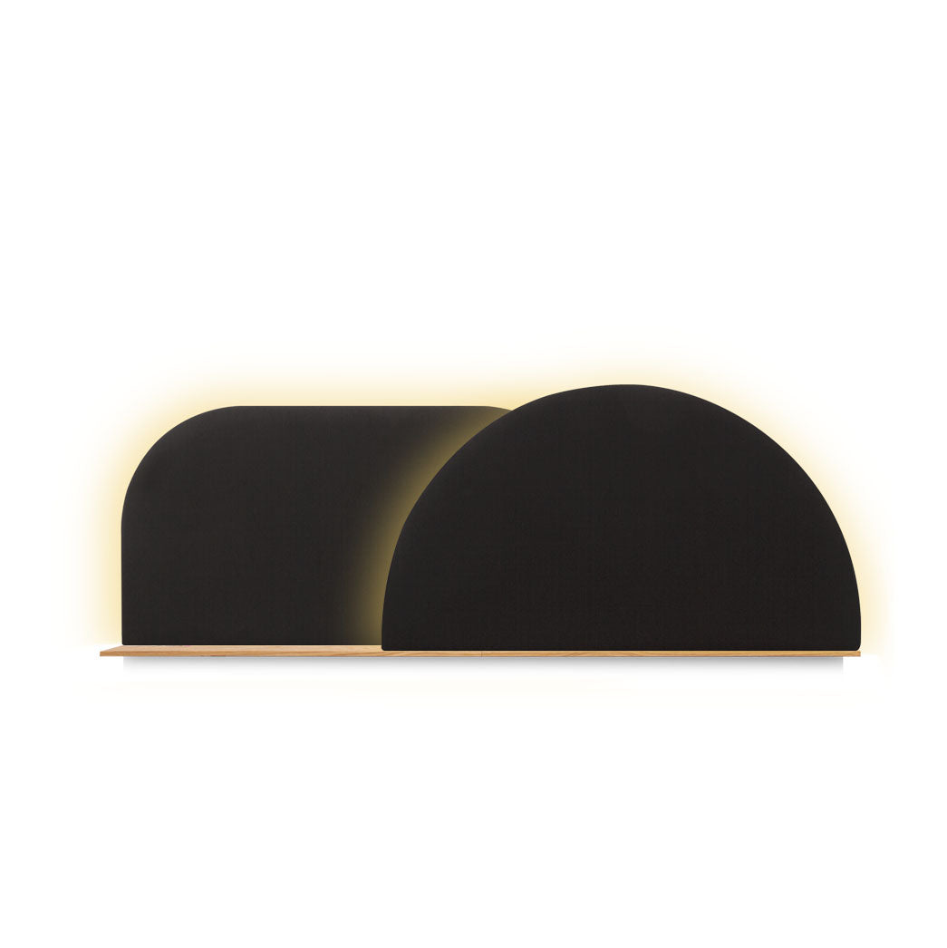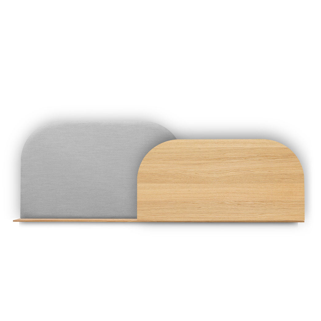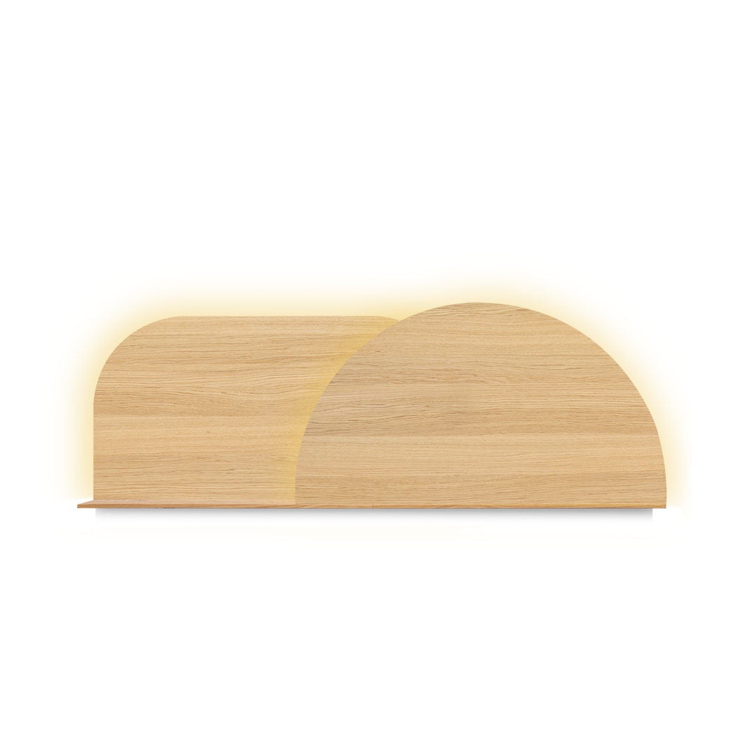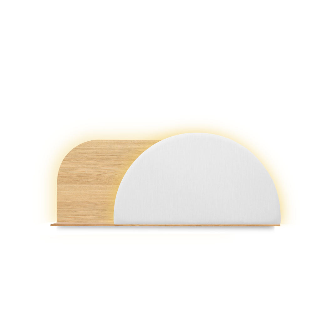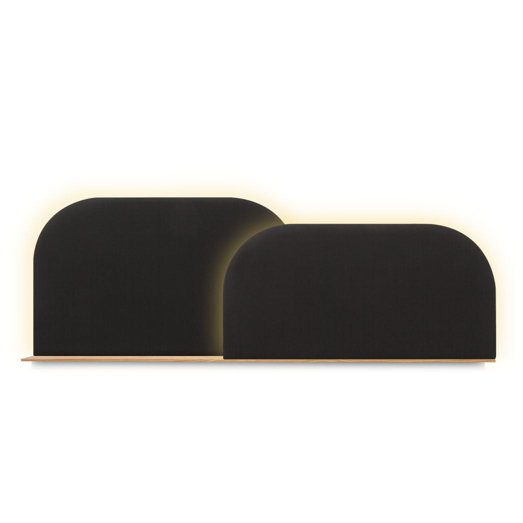 Nuestro Cabecero Alba consta de dos paneles que se superponen en el centro, disponibles en acabado de madera sostenible o hermoso textil, y combinados con un estante oculto para pequeños objetos cotidianos. Decida fácilmente en casa cómo instalarlos gracias a que todos los paneles son intercambiables. La pieza se completa con la posibilidad de añadir iluminación de fondo minimalista y regulable.