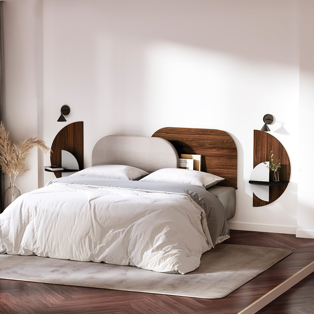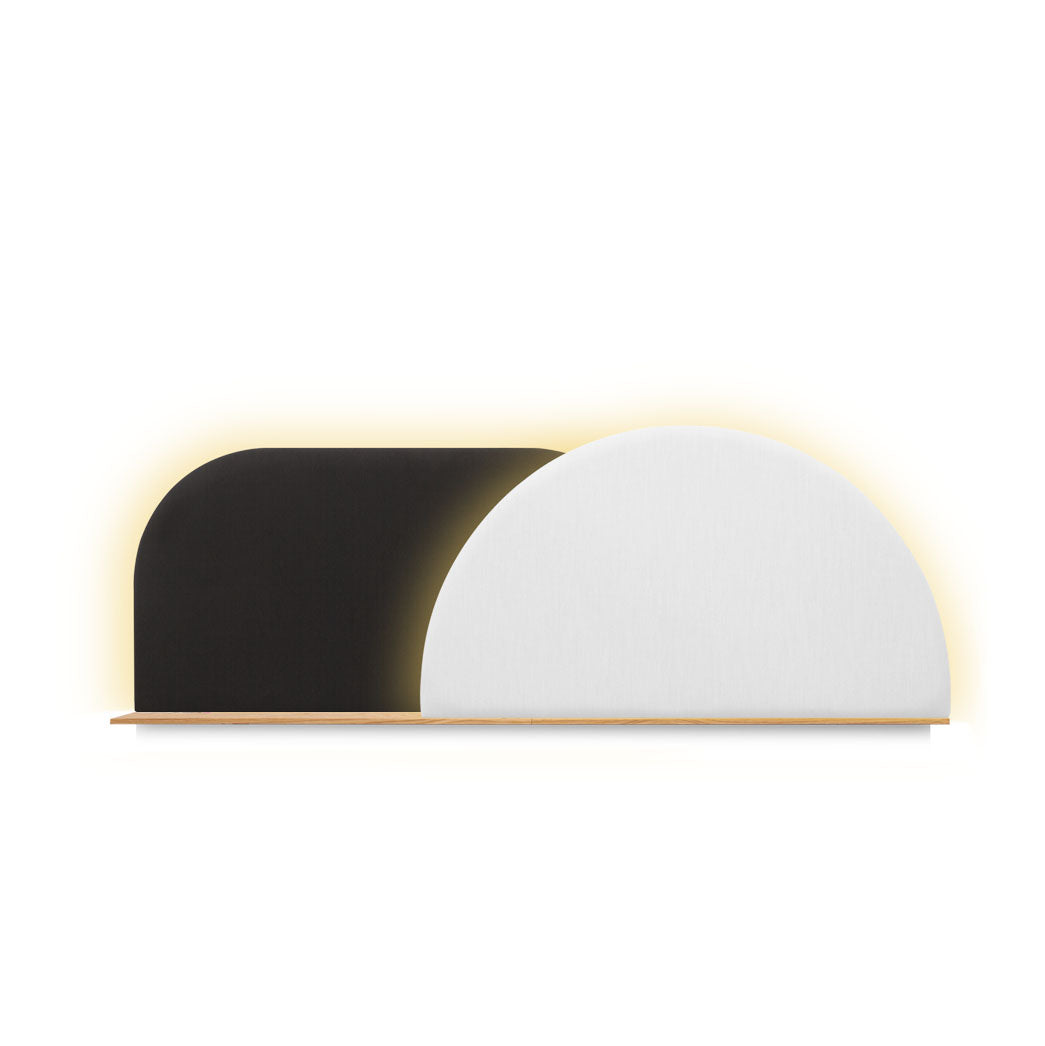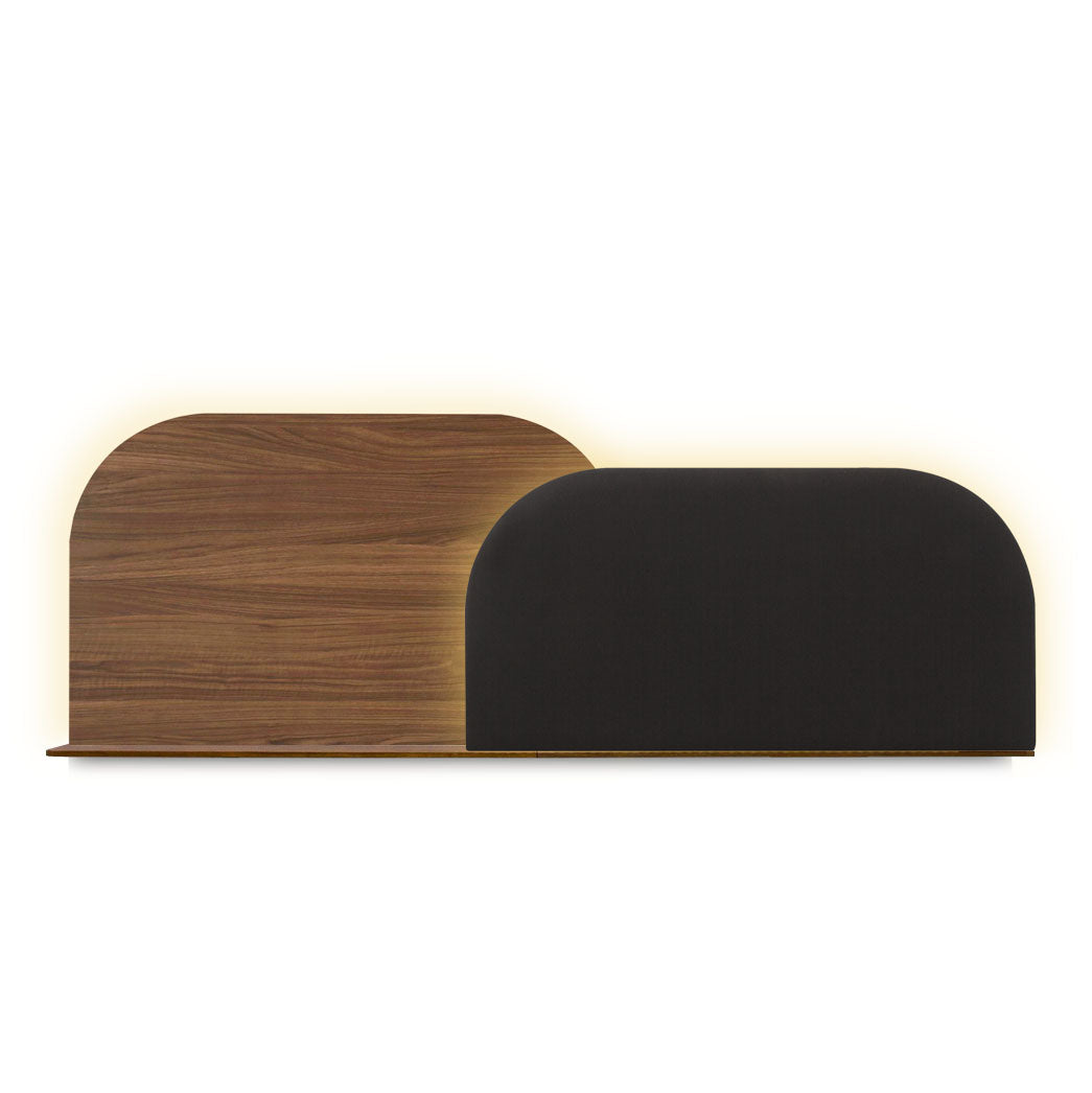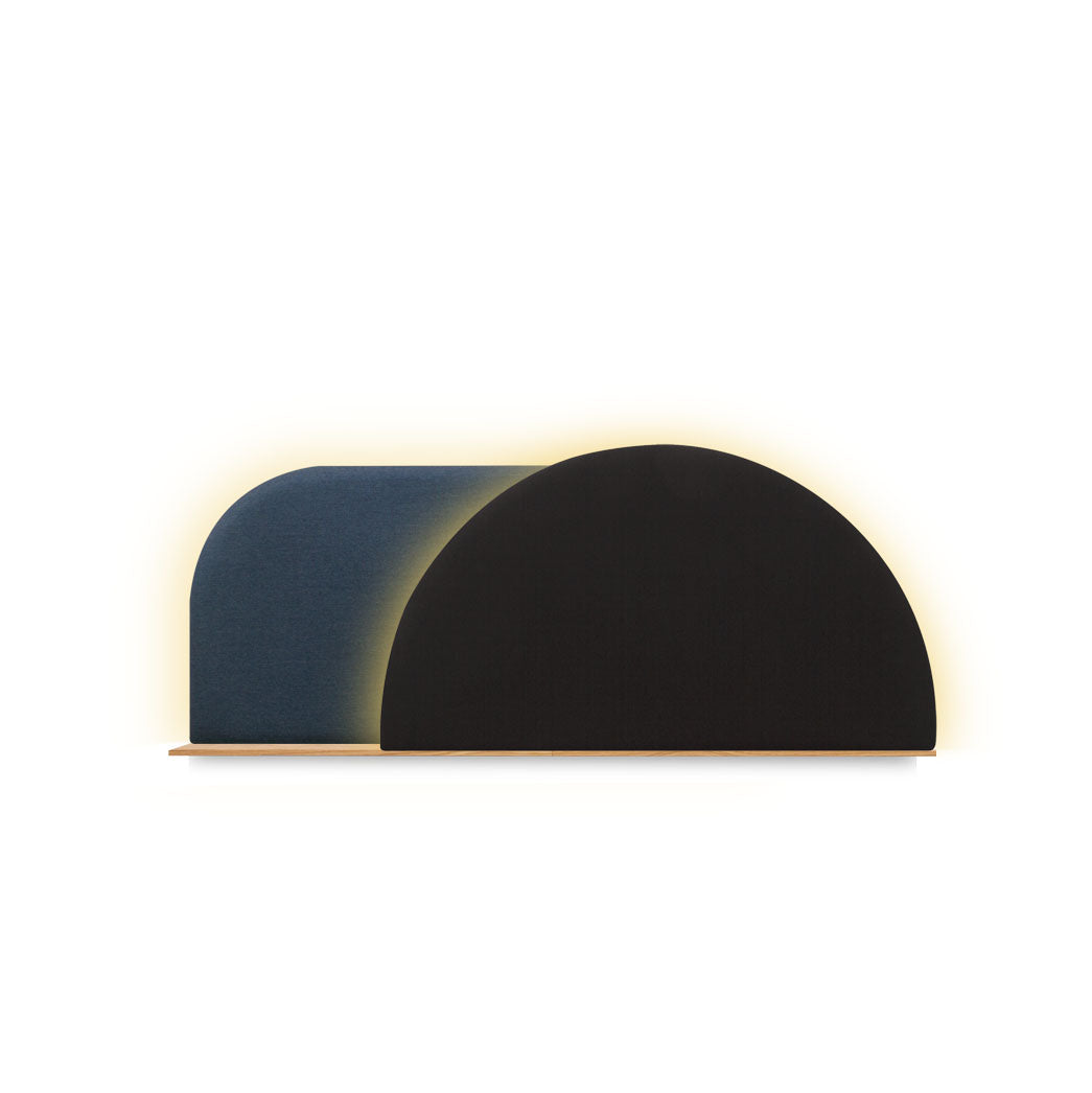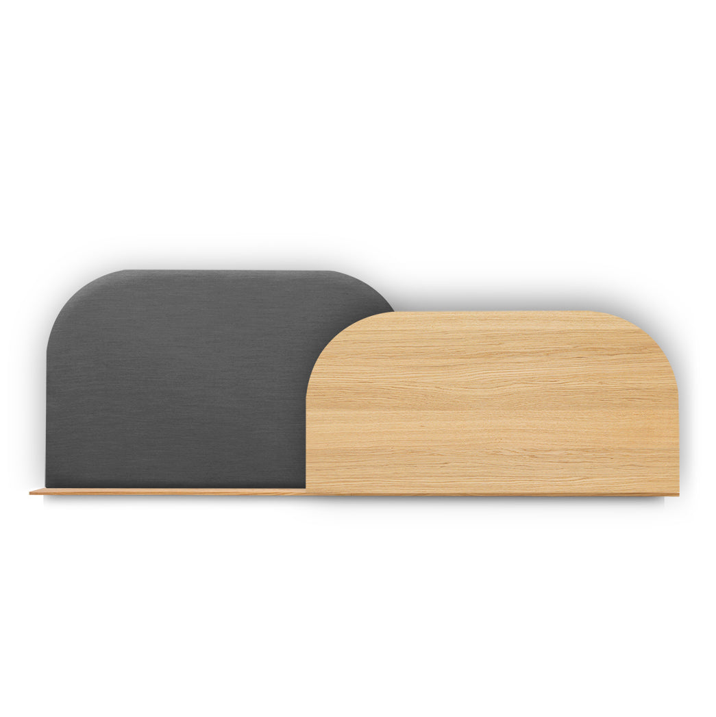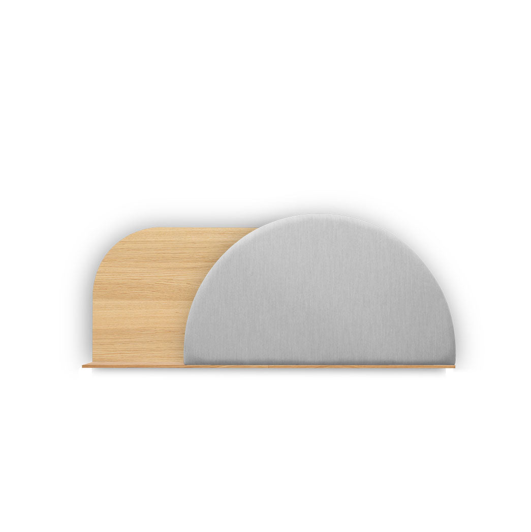 Nuestro Cabecero Alba consta de dos paneles que se superponen en el centro, disponibles en acabado de madera sostenible o hermoso textil, y combinados con un estante oculto para pequeños objetos cotidianos. Decida fácilmente en casa cómo instalarlos gracias a que todos los paneles son intercambiables. La pieza se completa con la posibilidad de añadir iluminación de fondo minimalista y regulable.