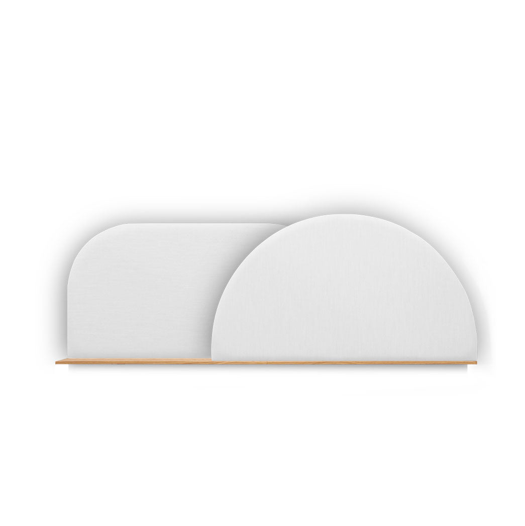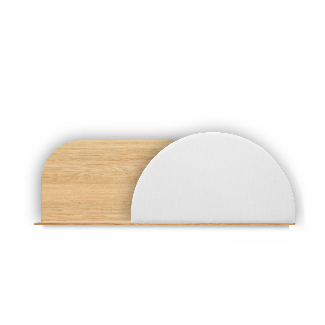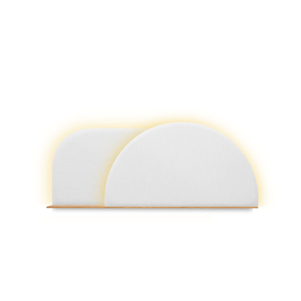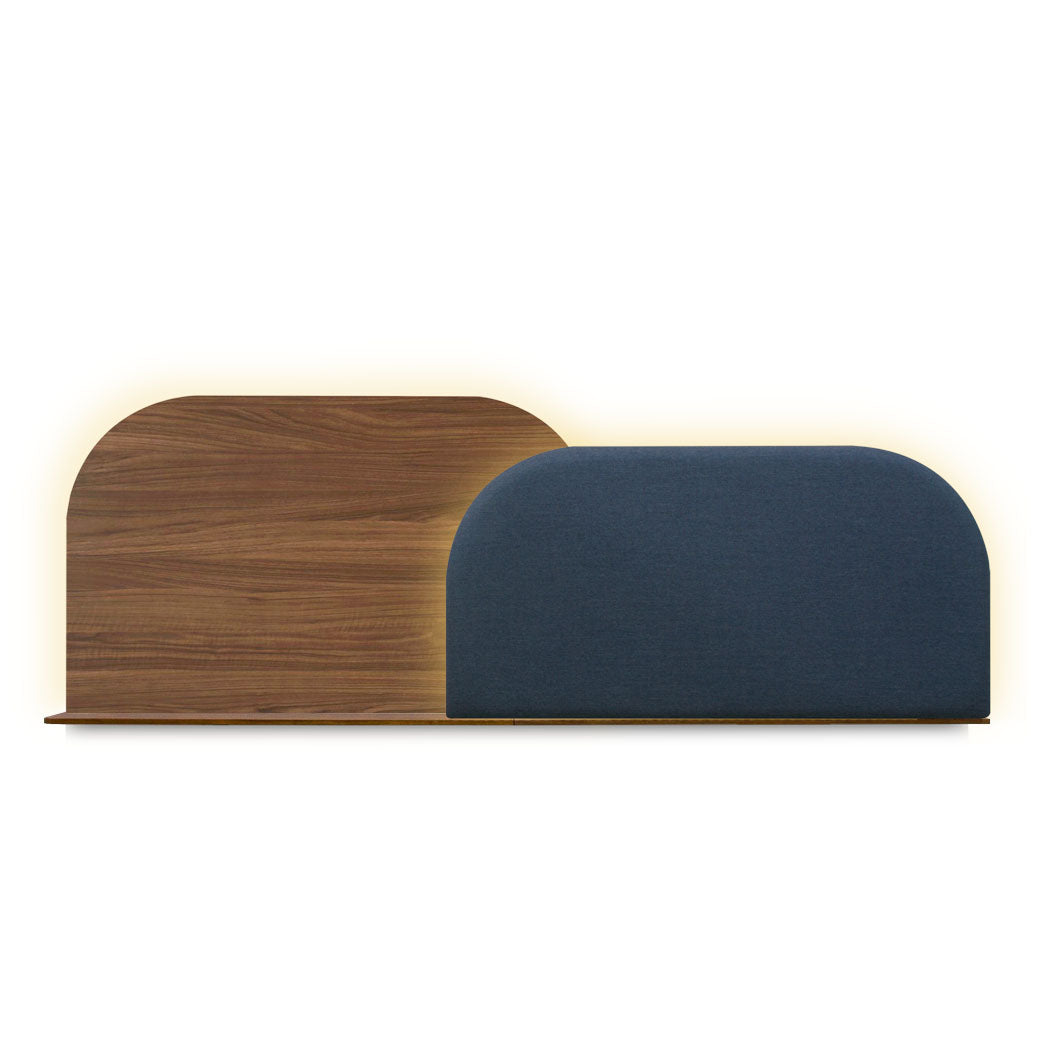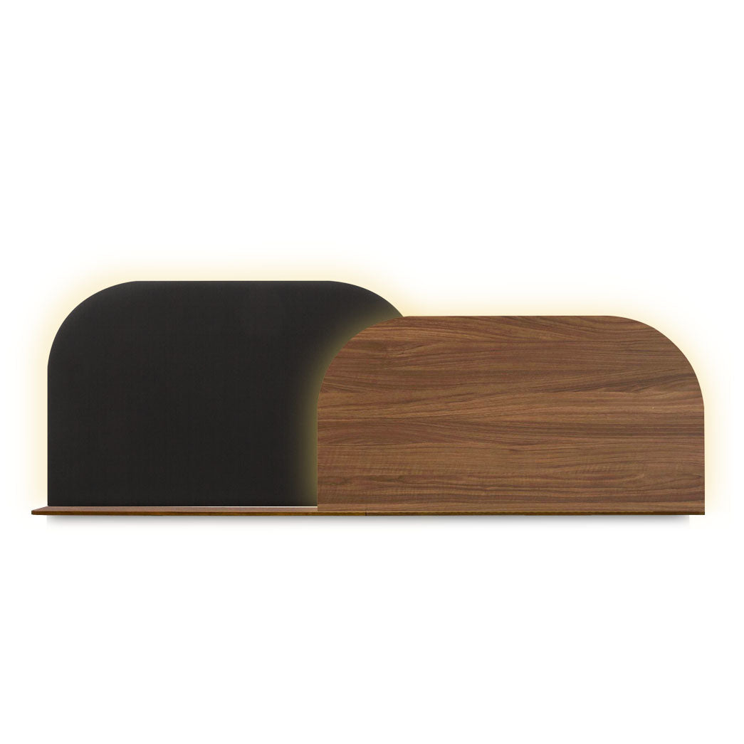 Nuestro Cabecero Alba consta de dos paneles que se superponen en el centro, disponibles en acabado de madera sostenible o hermoso textil, y combinados con un estante oculto para pequeños objetos cotidianos. Decida fácilmente en casa cómo instalarlos gracias a que todos los paneles son intercambiables. La pieza se completa con la posibilidad de añadir iluminación de fondo minimalista y regulable.