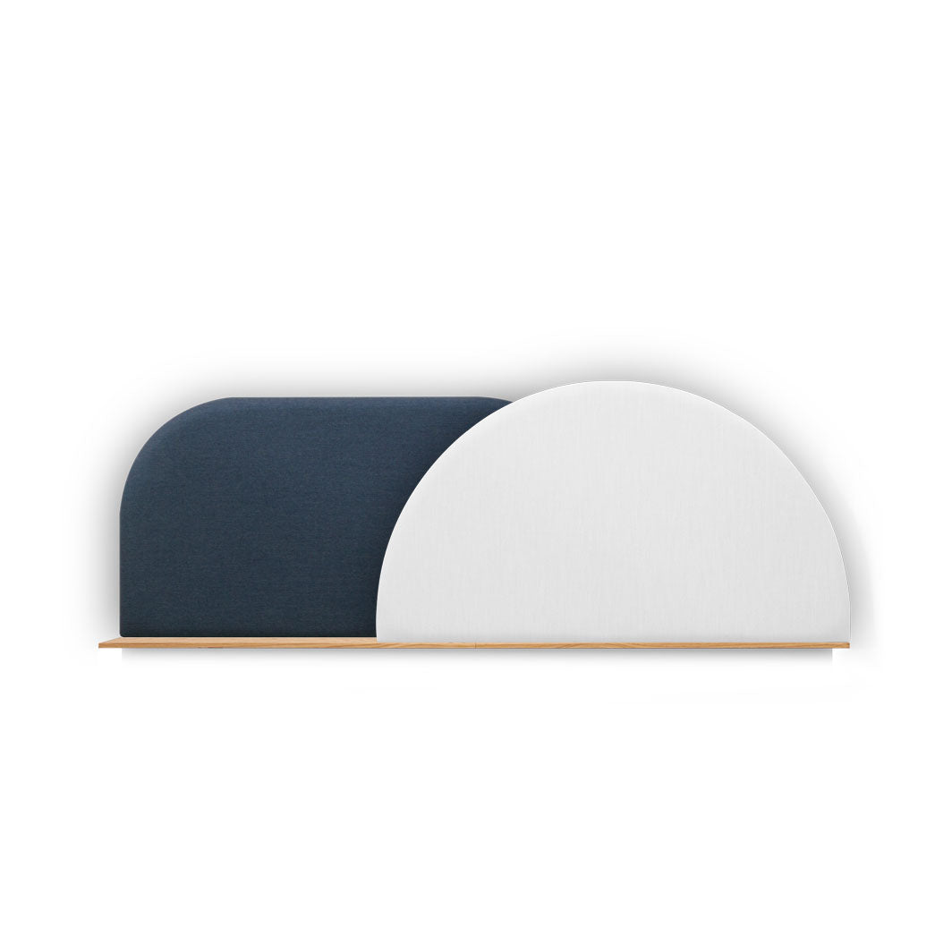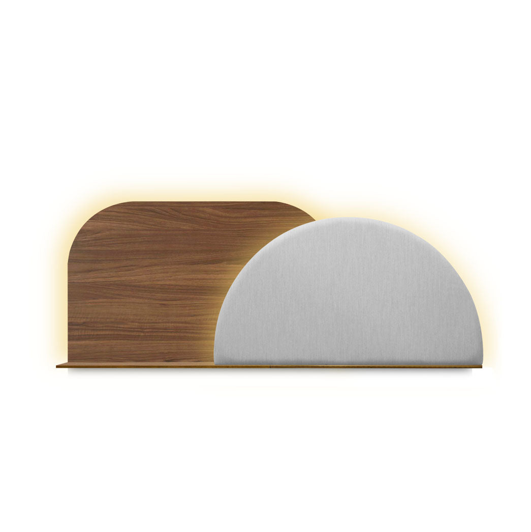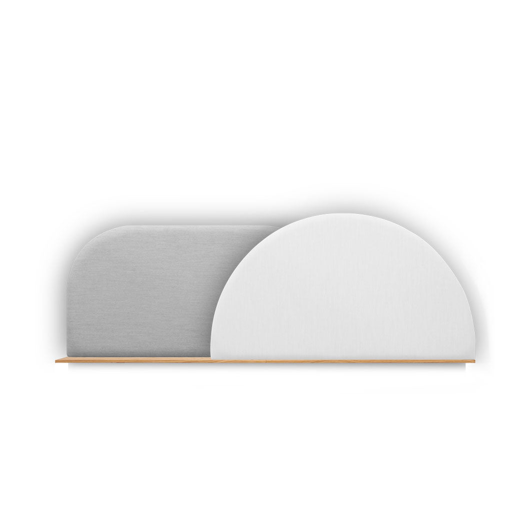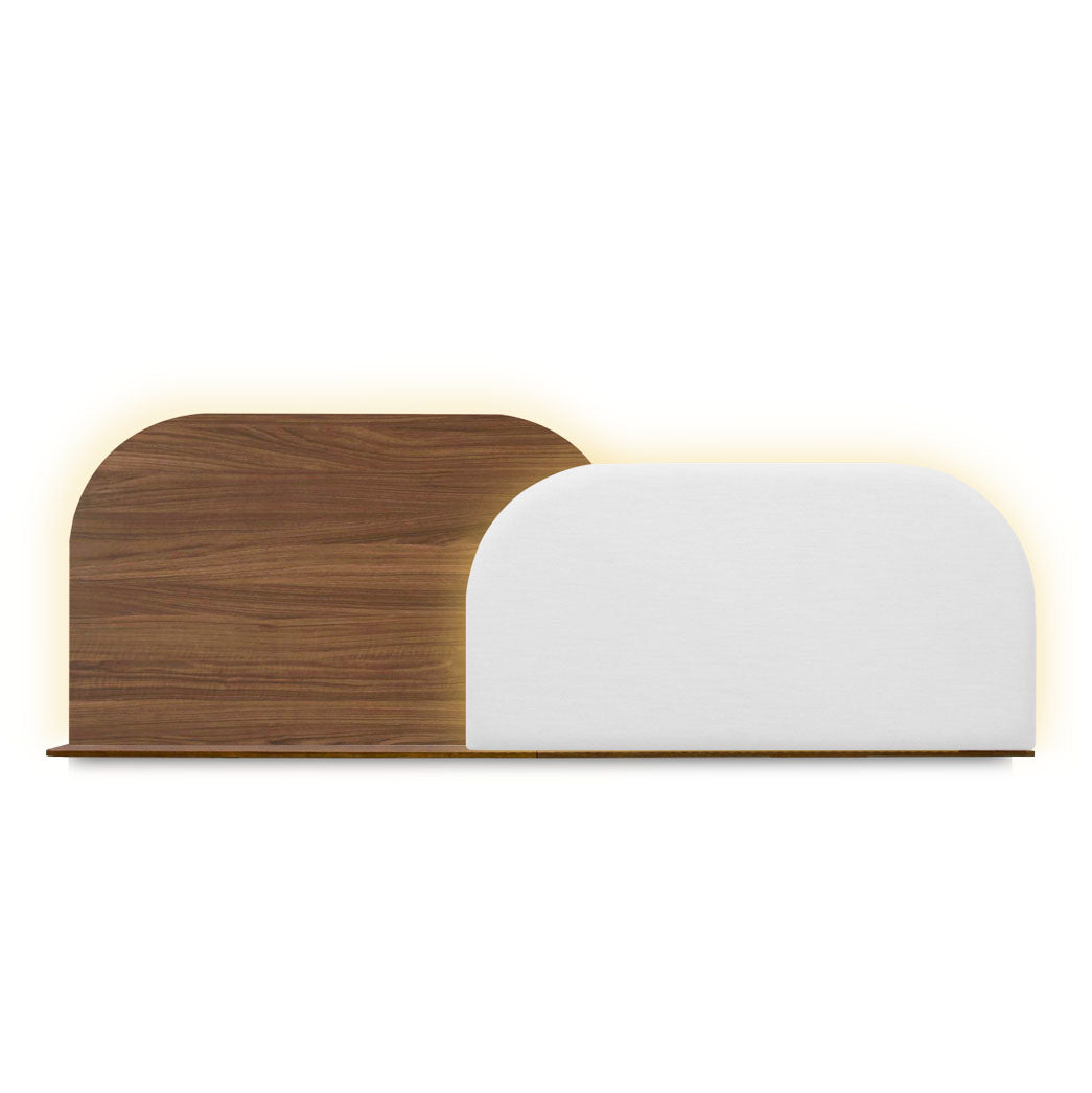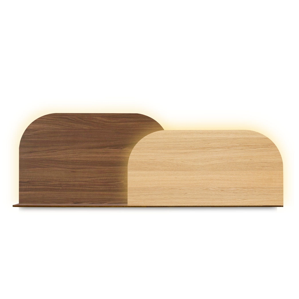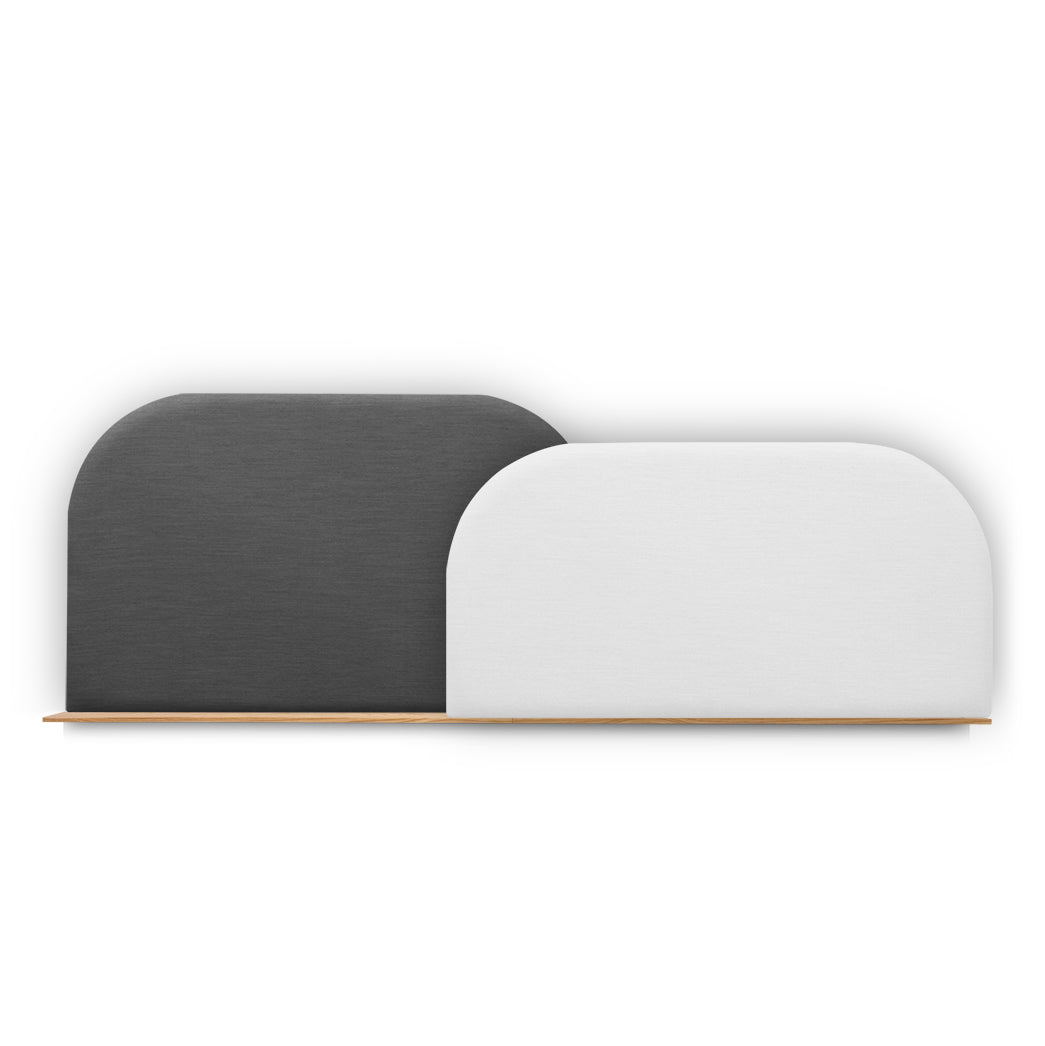 Nuestro Cabecero Alba consta de dos paneles que se superponen en el centro, disponibles en acabado de madera sostenible o hermoso textil, y combinados con un estante oculto para pequeños objetos cotidianos. Decida fácilmente en casa cómo instalarlos gracias a que todos los paneles son intercambiables. La pieza se completa con la posibilidad de añadir iluminación de fondo minimalista y regulable.
