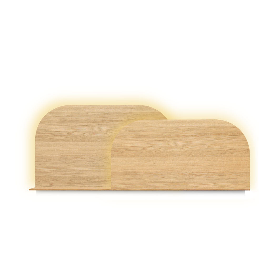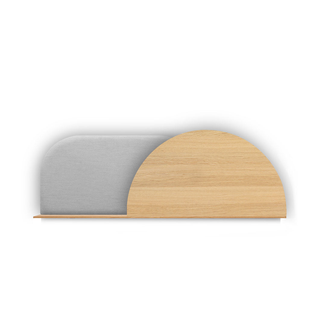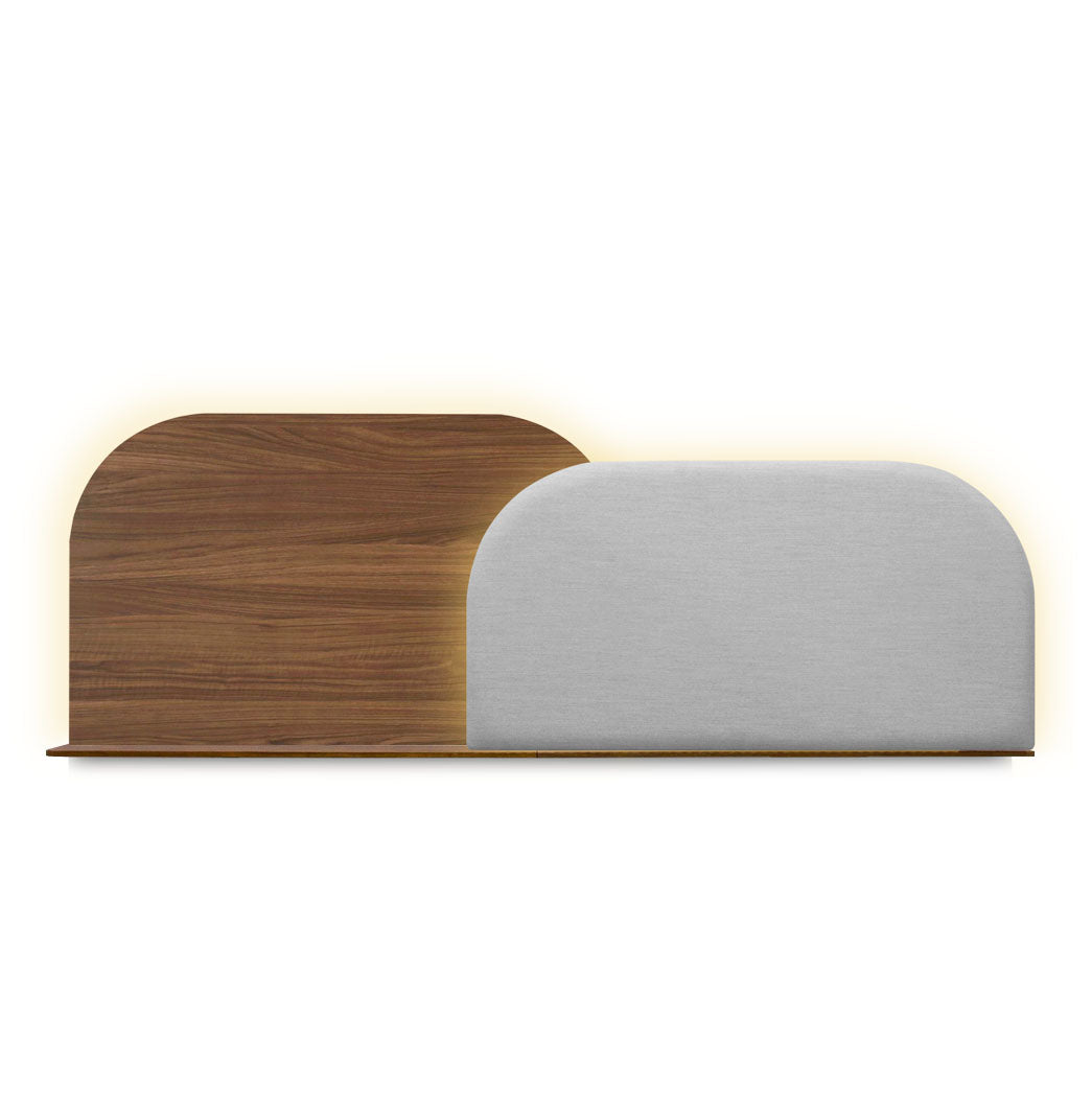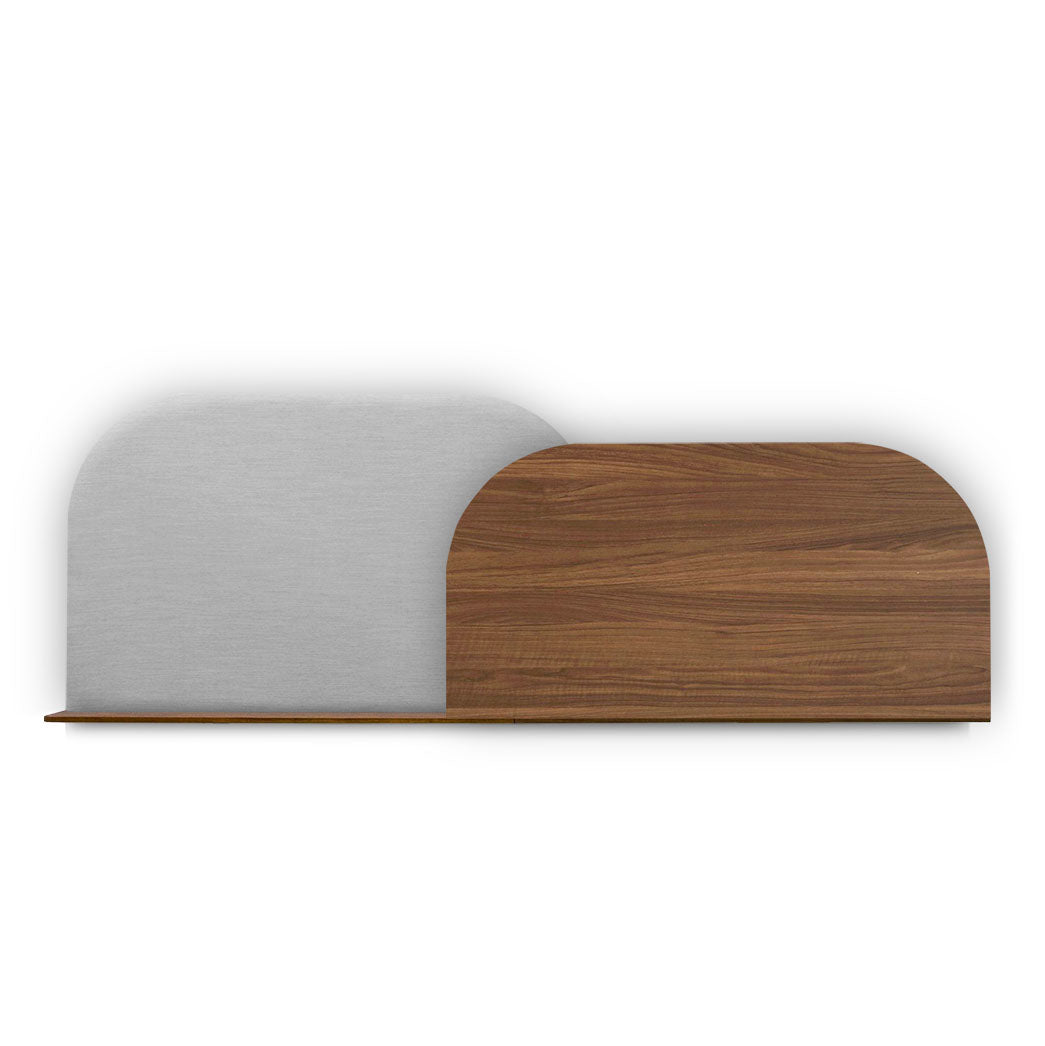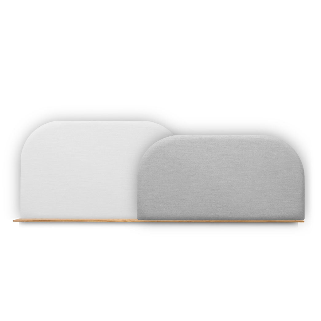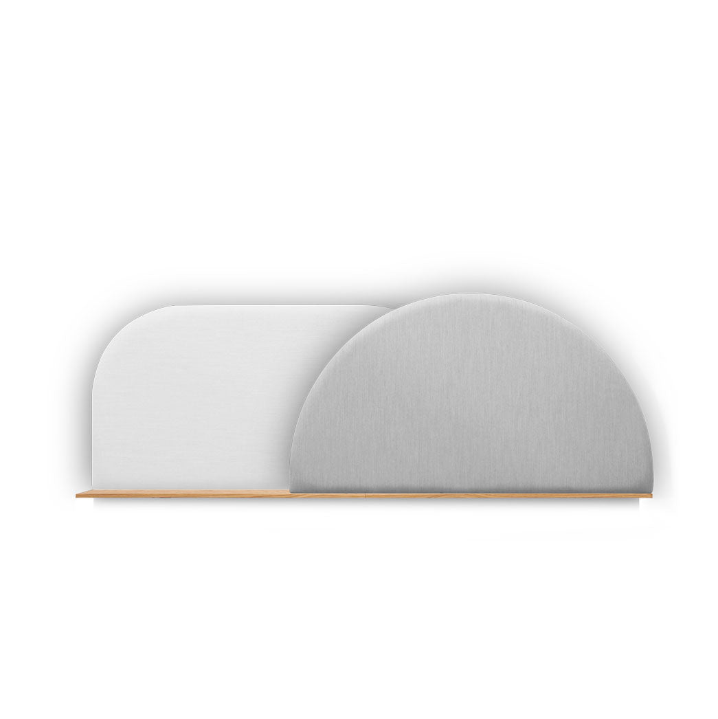 Nuestro Cabecero Alba consta de dos paneles que se superponen en el centro, disponibles en acabado de madera sostenible o hermoso textil, y combinados con un estante oculto para pequeños objetos cotidianos. Decida fácilmente en casa cómo instalarlos gracias a que todos los paneles son intercambiables. La pieza se completa con la posibilidad de añadir iluminación de fondo minimalista y regulable.