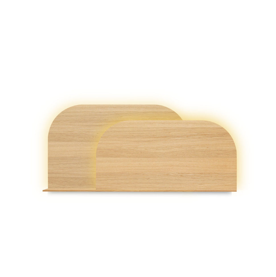 Nuestro Cabecero Alba consta de dos paneles que se superponen en el centro, disponibles en acabado de madera sostenible o hermoso textil, y combinados con un estante oculto para pequeños objetos cotidianos. Decida fácilmente en casa cómo instalarlos gracias a que todos los paneles son intercambiables. La pieza se completa con la posibilidad de añadir iluminación de fondo minimalista y regulable.