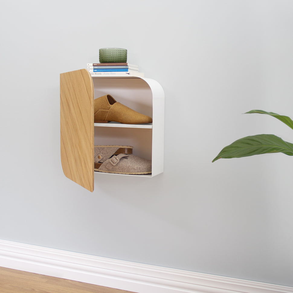 Nuestro gabinete Cielo es una pieza versátil y única de almacenamiento de pared, inicialmente diseñada como un zapatero pero con la posibilidad de muchos otros usos. Gracias a su funcionalidad, puede ser colocado en cualquier habitación a cualquier altura, facilitando el almacenamiento de objetos cotidianos mientras mantiene el espacio organizado.